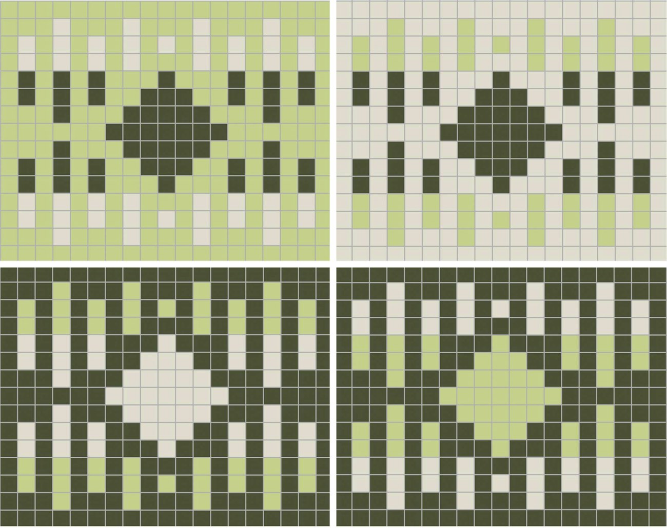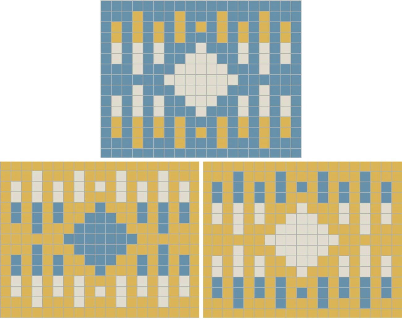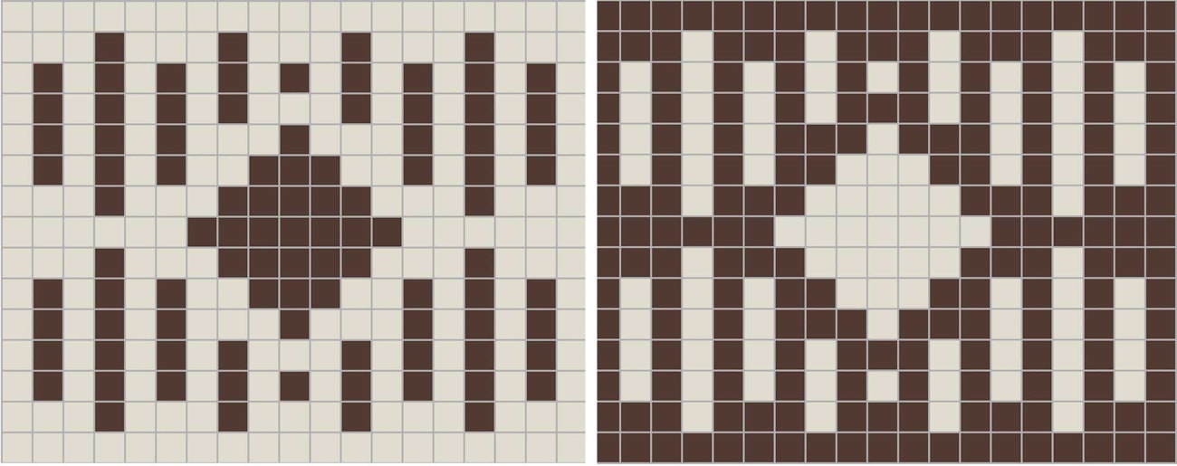 The chart in the pattern proper for the Amplitude Pullover benefits from the contrast between the dark background of the rich blue Granito Azul (blue) with the muted pop of the Granito Gold (yellow) and the natural shade of Granito (gray), as you can see in the image above. A knitter might be inspired to reduce the chart to pure contrast using just two colors—light stitches against a dark background, or flip it and place dark stitches against a lighter background. With charting software, we can preview these alternatives using the La Rinconada colors Niebla (light) and Tierra (dark).