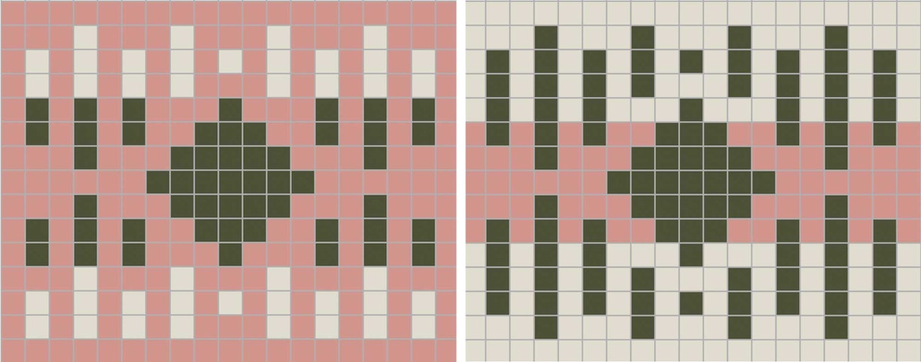 Not to neglect the moody pinks that this yarn comes in, here’s the chart worked using Niebla Rosa (pink over pale), Tierra Verde (green over dark), and undyed Niebla, with the pattern stripe happening in the design stitches (shown at left). And for something just a little different, here is that same pattern stripe but worked in the background stitches (shown at right).