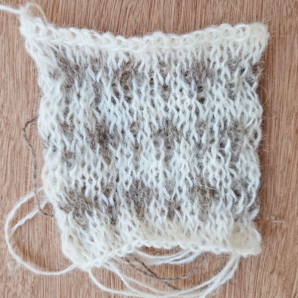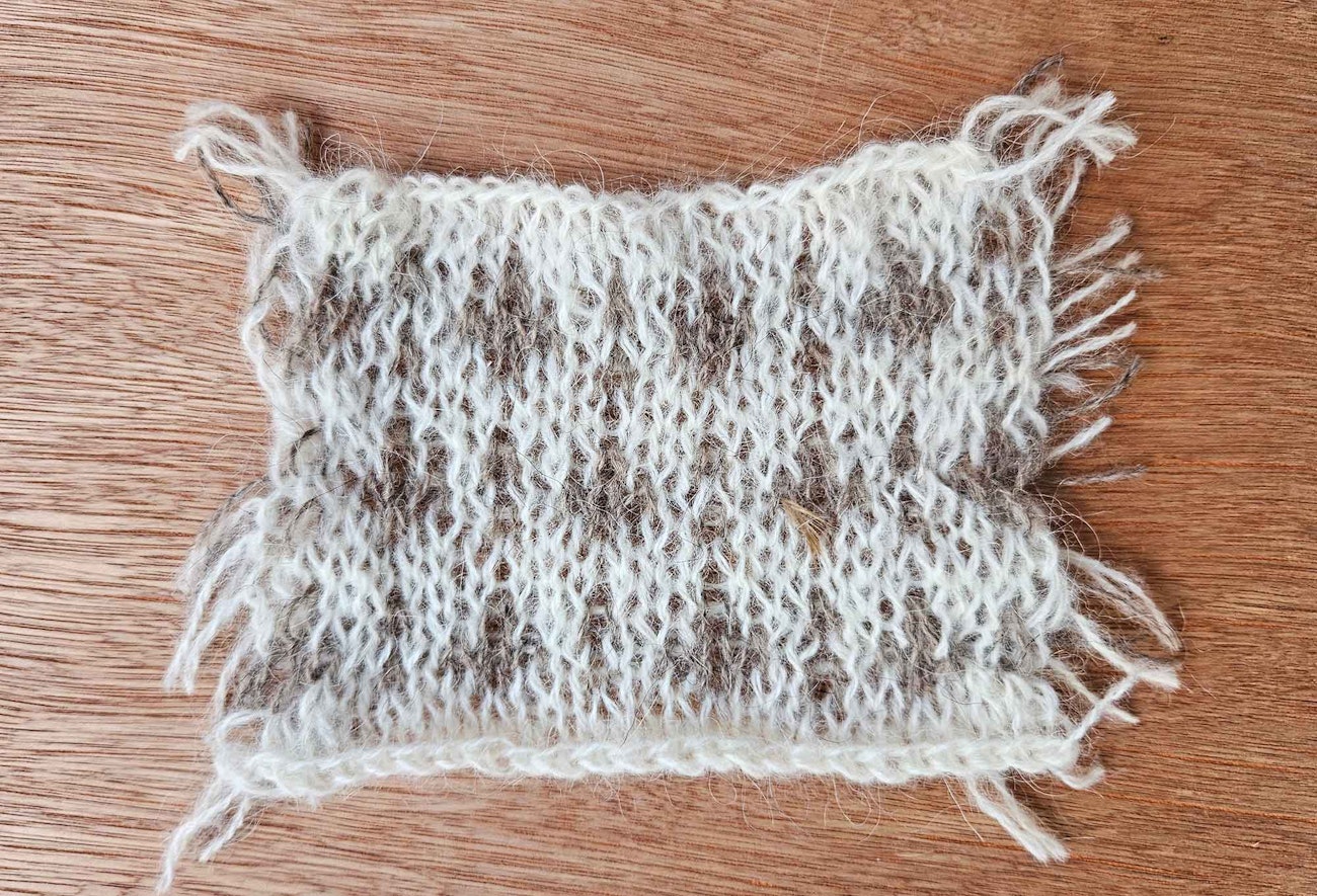 I first knitted a single-color swatch in Oak with the needle size suggested on the ball band, a US Size 6 (4 mm). I achieved a gauge of about 20 sts per 4" (10 cm), which puts it in the DK-weight range. At this gauge, Brushed Tradition forms a cohesive fabric with a noticeable halo that would make an excellent sweater to be worn over a shirt. Although somewhat softer than a comparable Lopi yarn, I wouldn’t rate it as next-to-skin soft for most people.