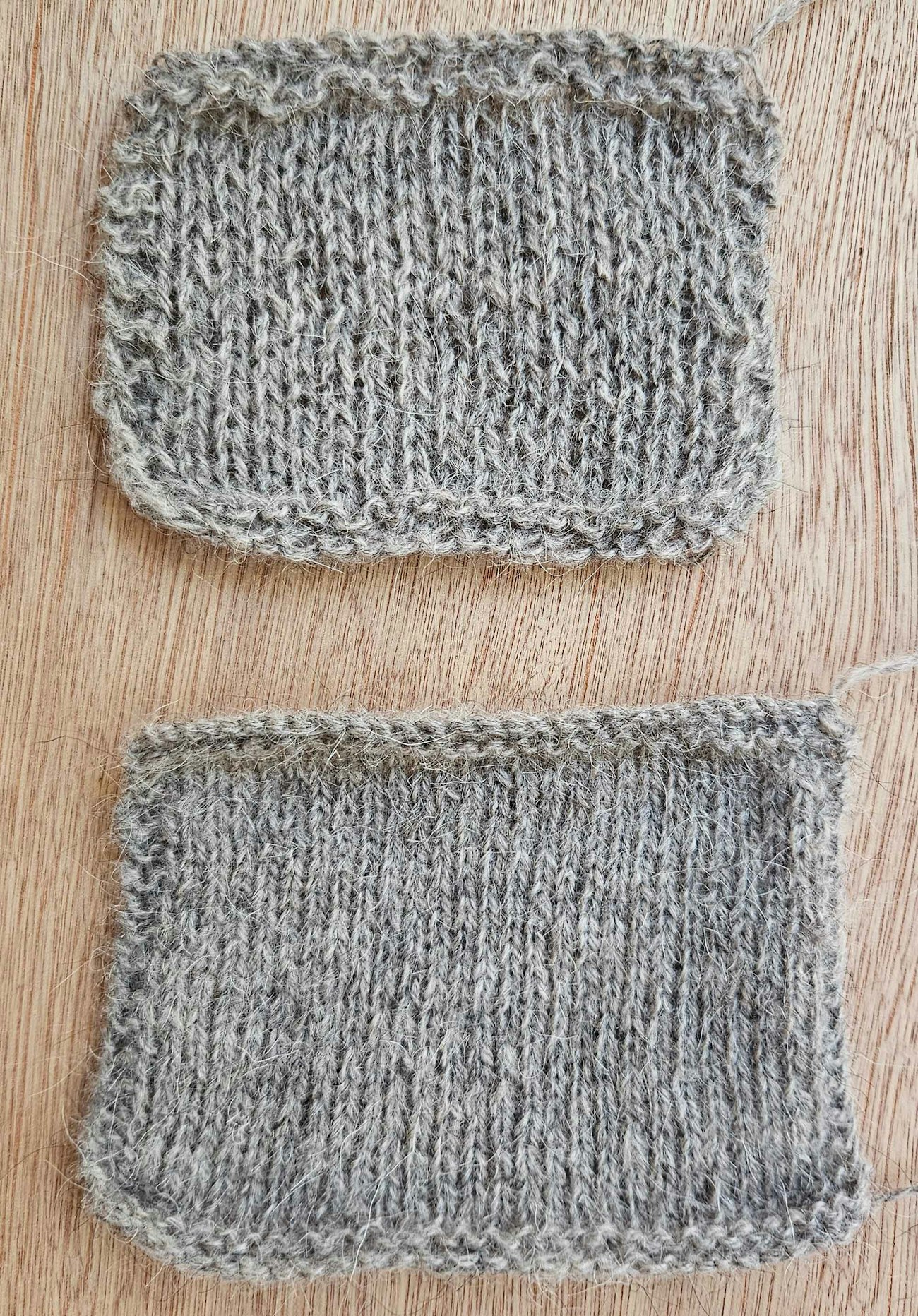 I swatched using various sizes of both wood and metal needles; I found the yarn to be a bit splitty when using sharp metal needles, but not so much with wooden needles. I wet-blocked the swatches in warm-to-hot water for around 20 minutes and left to dry. I didn’t stretch them, but I did pin the plain stockinette swatches, as I found they tended to curl at the edges.