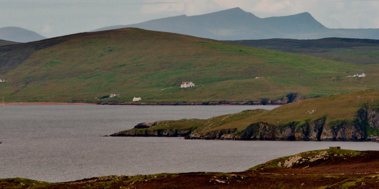 Foula is one of the Shetland Islands, a group of islands off the coast of Scotland that is the northernmost part of the United Kingdom. It lies about 14 miles west of the biggest Shetland island, Mainland. Foula is about 3½ miles long by 2½ miles wide. With five peaks, the Noup, Hamnafield, the Sneug, Kame (the highest vertical sea cliff in Britain*), and Soberlie, the distinctive shape of the island is visible from many parts of Shetland Mainland, offering a slightly different silhouette from each viewpoint.