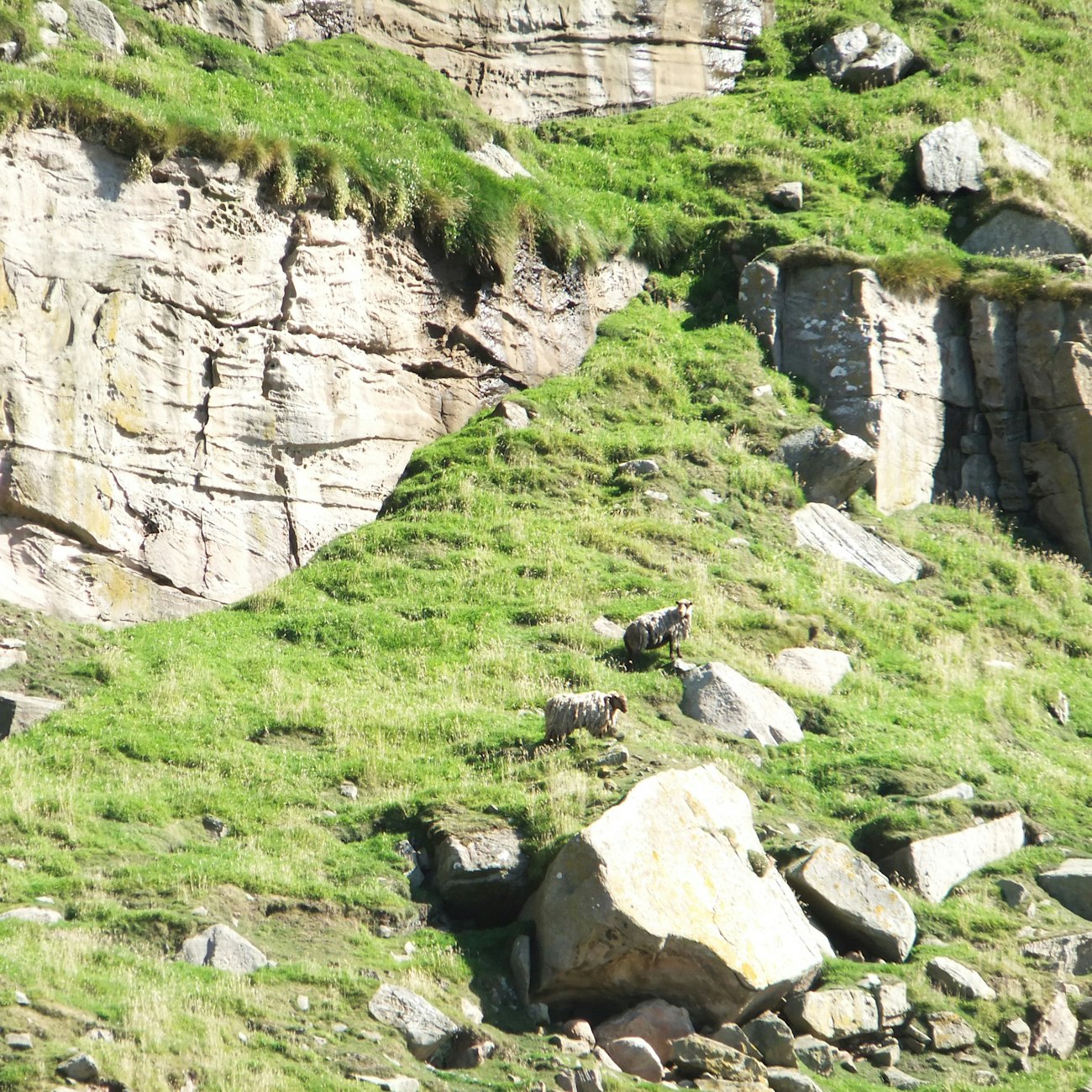 Can you see sheep? Grazing sheep blend into their craggy environment on Foula.