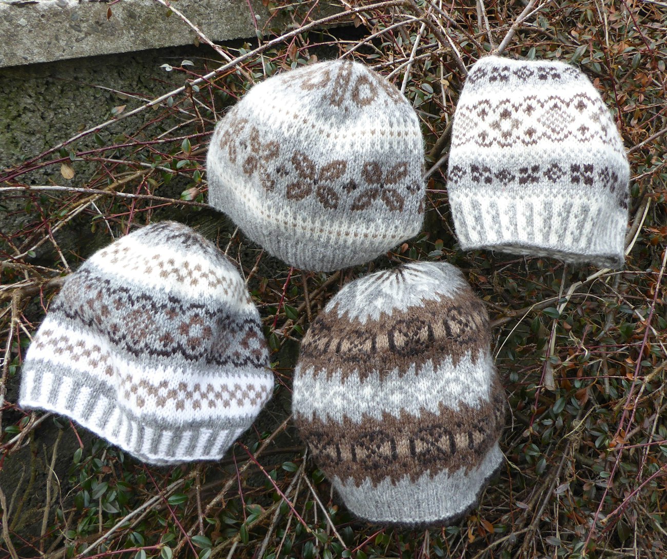 Traditional Shetland patterns adorn these lovely hats knitted by the author from Foula Wool.
