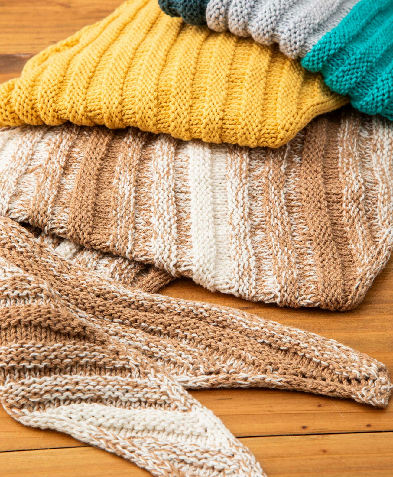 Three Furrow Scarves (from top): Blue Sky Fibers Organic Cotton Sport, Appalachian Baby Designs US Organic Cotton Sport, and 10/2 Foxfibre. Photo by Matt Graves
