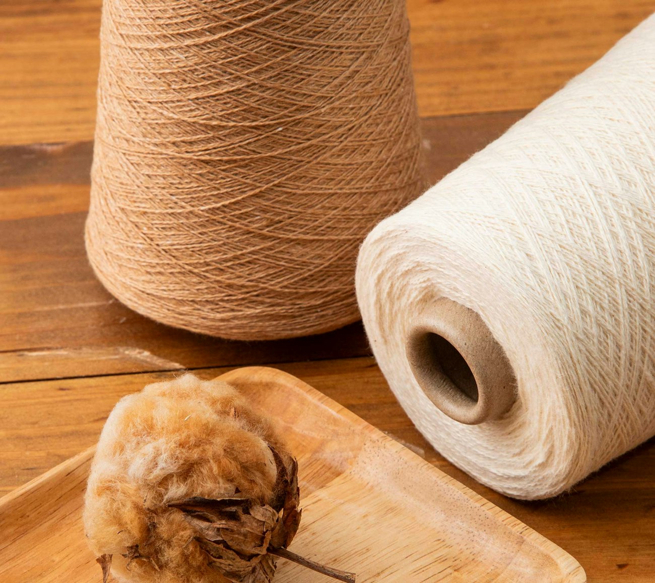 A brown cotton boll from Sally's farm and cones of her 10/2 cotton yarn. Photo by Matt Graves