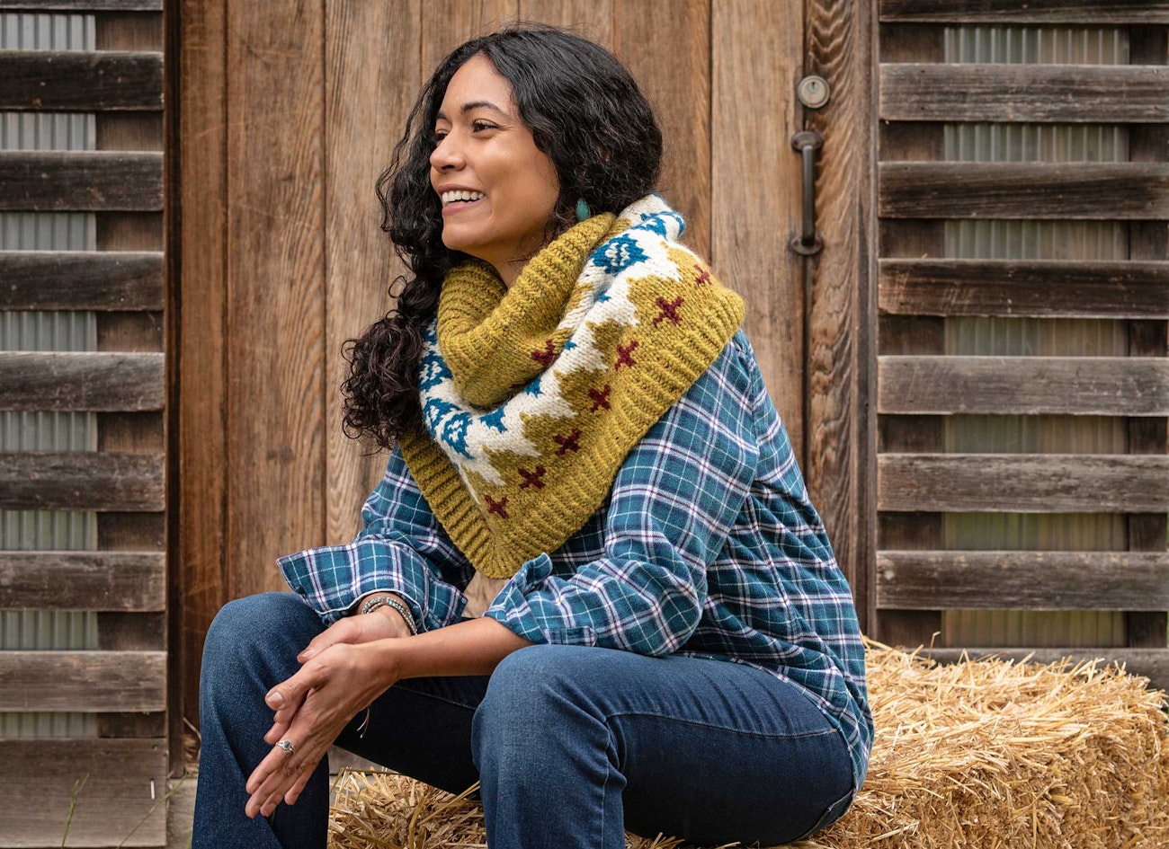 Our feature articles often have companion projects. The Fall 2025 issue included an article about the history of Peace Fleece yarns, and Tressa Weidenaar’s Rancher’s Cowl put Peace Fleeces’s yarn to perfect use. Photo by Gale Zucker
