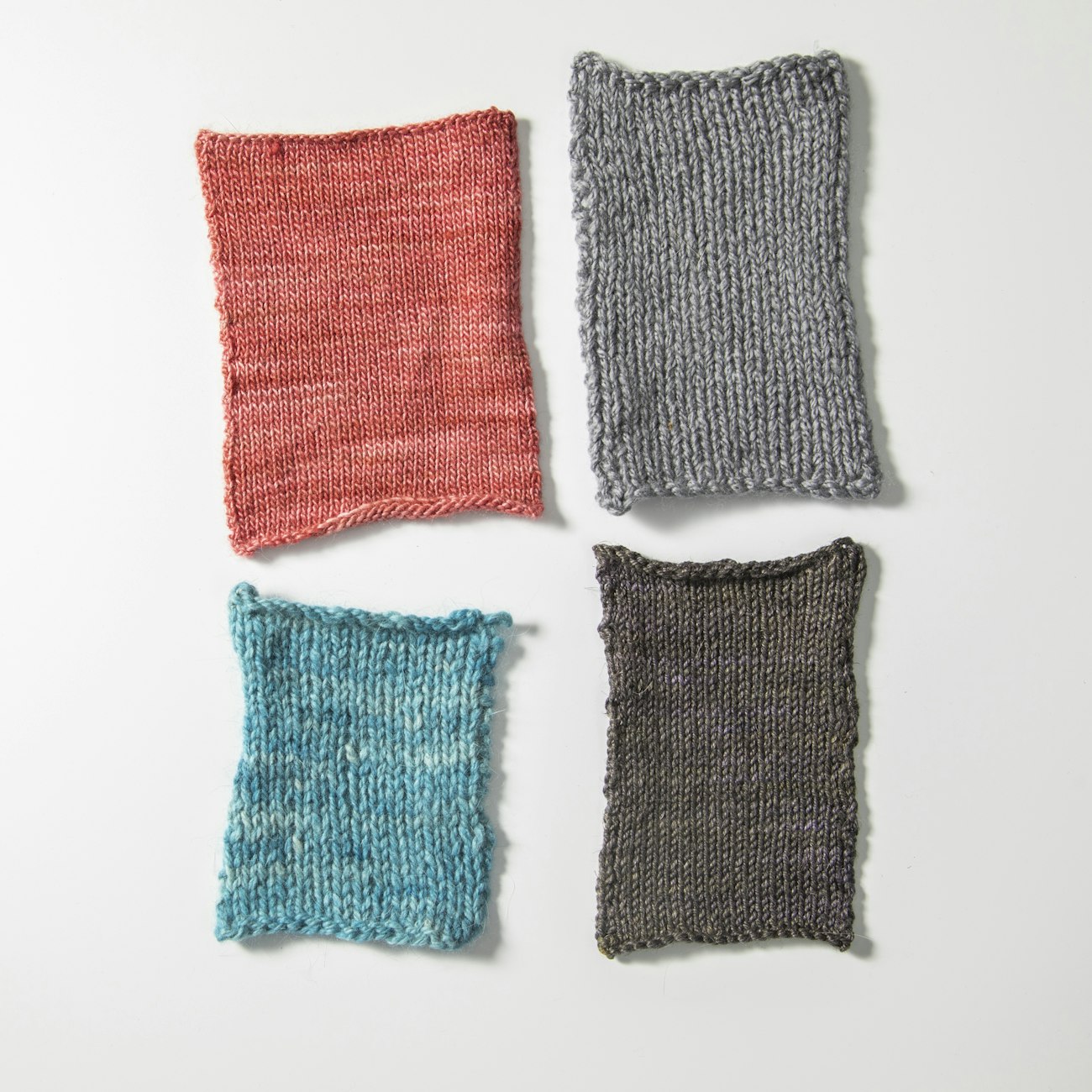 The pink swatch was knitted on size 2½ (3 mm) needles, is 5" x 4", and used about .25 grams of yarn per square inch. The light gray swatch was knitted on size 9 (5.5 mm) needles, is 5¼" x 2¾", and used about .33 grams of yarn per square inch. The dark gray swatch was knitted on size 3 (3.25 mm) needles, is 5" x 3¼", and used about .32 grams of yarn per square inch. The teal swatch was knitted on size 6 (4 mm) needles, is 4¼" x 3½", and used about .34 grams of yarn per square inch. Measuring by weight, thin yarn goes farther than thick.