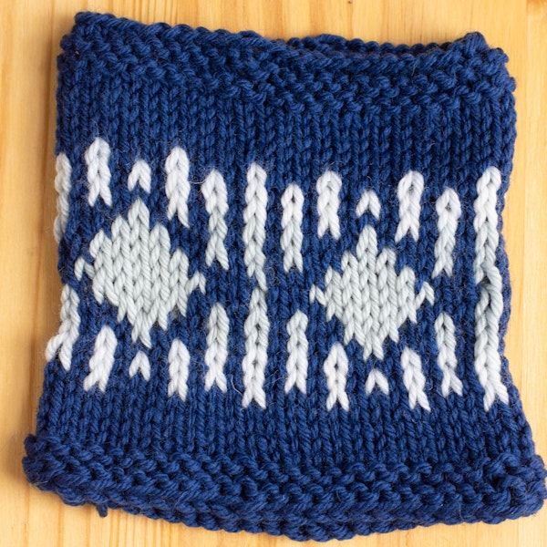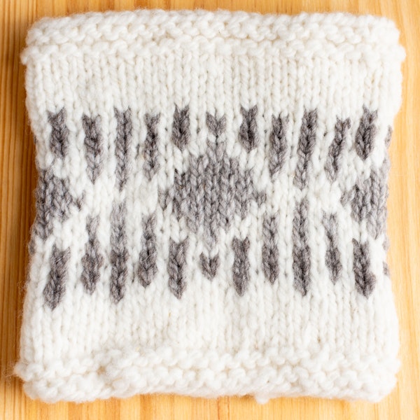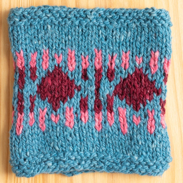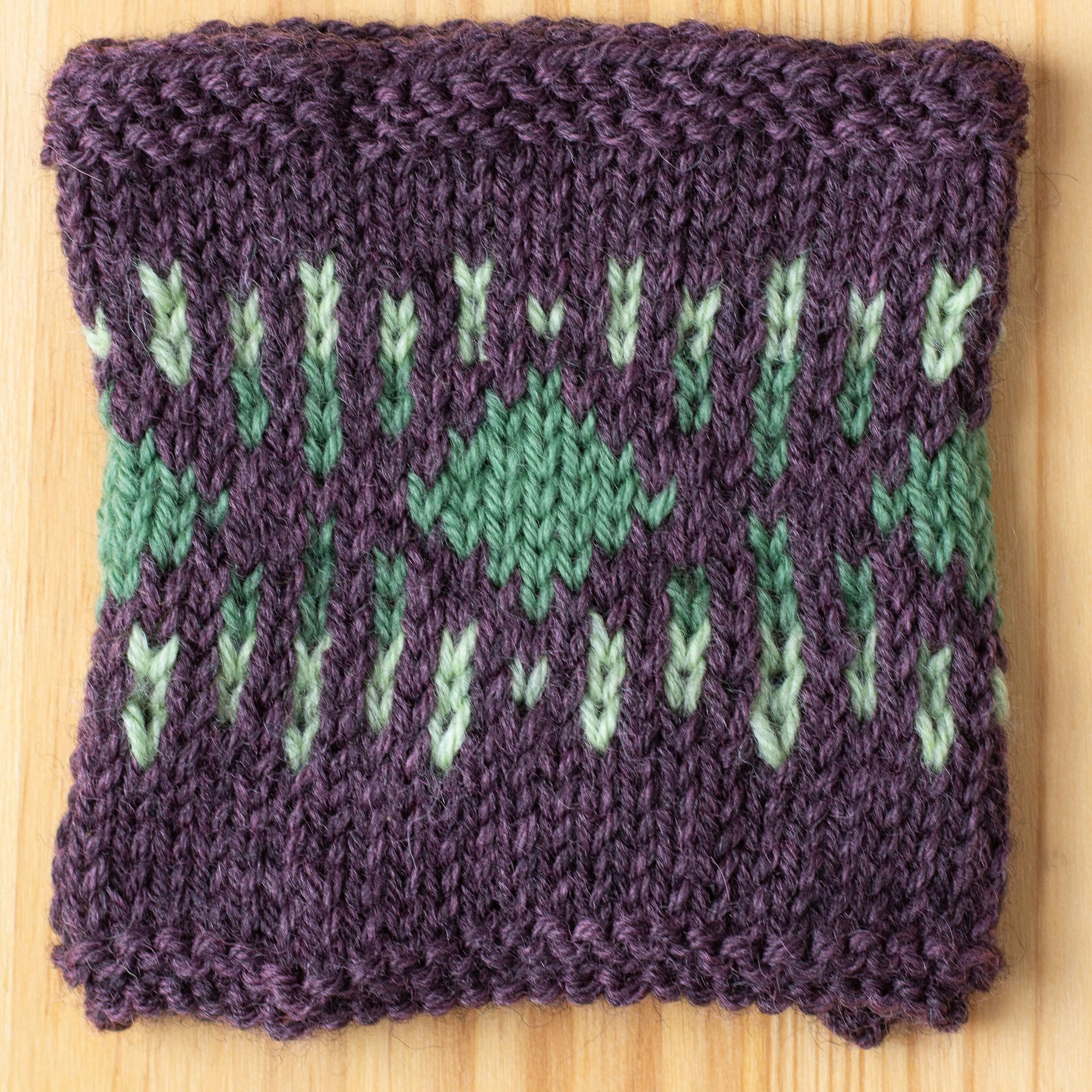 Tasting Notes: This yarn was bouncy and squishy and pleasant to knit with. I’d call the yarn a heavy worsted weight. It was a little bit difficult to keep the stranded colorwork even, and the washed swatch felt loose and floppy.