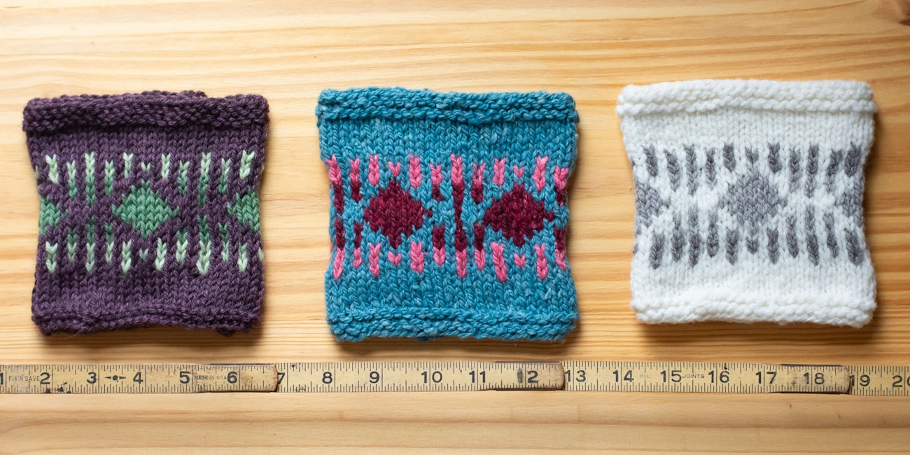 Your swatch needs to be knitted with the same needles, the same yarn, and in the same way as your final project. The Amplitude Pullover is knitted in the round, so all of my swatches were in the round. I used bamboo needles for my swatches, so those are the needles I’ll need to use for the sweater—especially if I’m making any adjustments based on my gauge swatch.