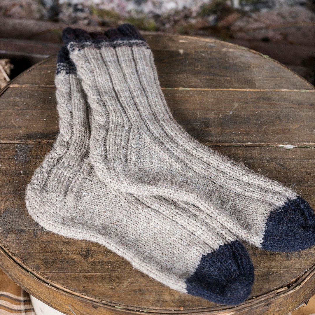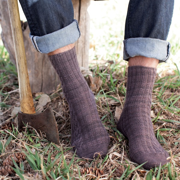 These comfy socks have a touch of colorwork and surprise cables running up the backs of the heels. Knit up in soft, lofty DK-weight wool, they fly off your needles—making them a good fit even for the sock-averse knitter.