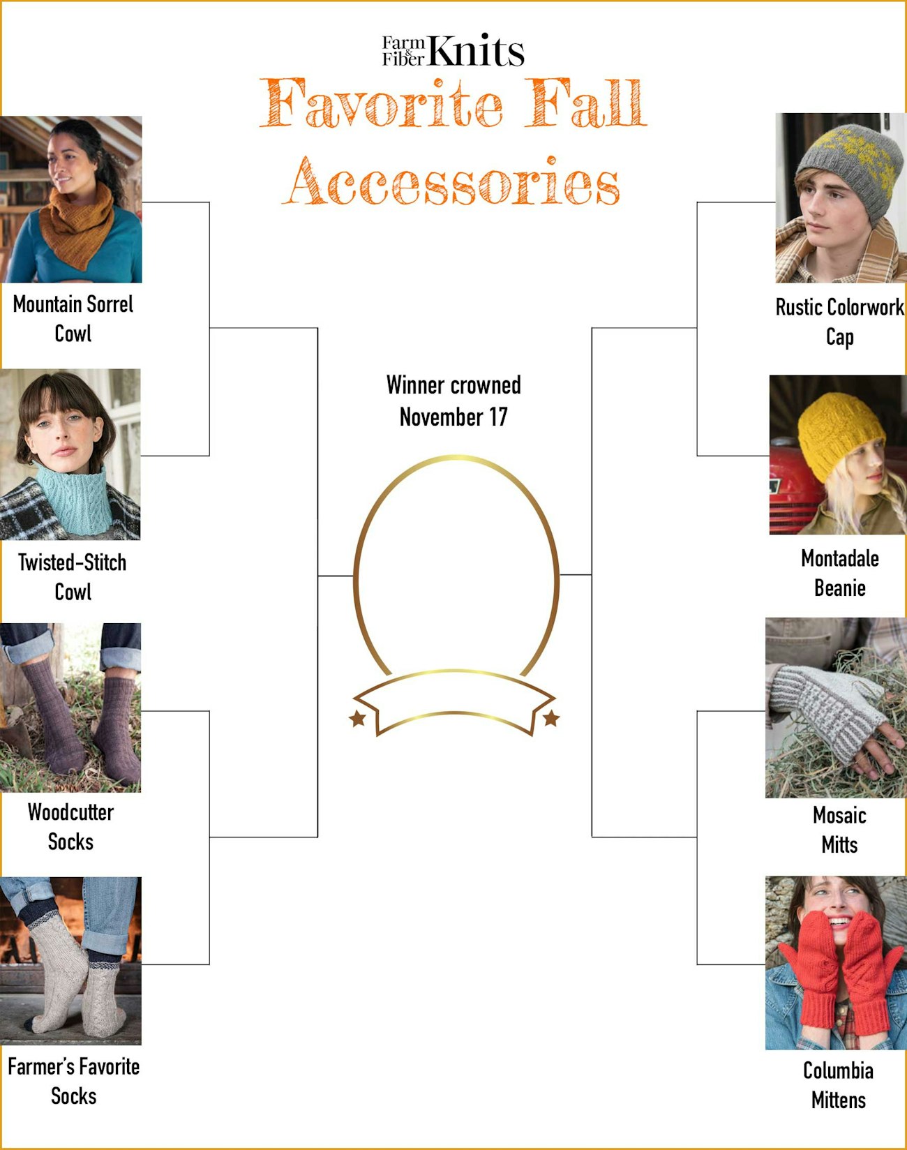Autumn is here, which means it’s time to dig out your favorite cool-weather accessories—think cozy hats and cowls, toasty socks, and warm mittens. To jump start your fall and/or holiday knitting, we’d like to offer our readers a free pattern for one full week this November. But first, we need your help in crowning the Farm & Fiber Knits 2025 Favorite Fall Accessory.