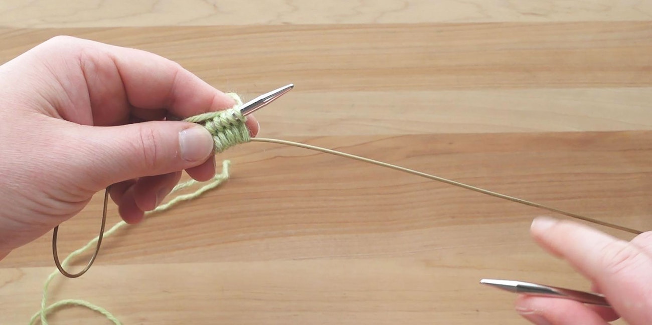 Pull the bottom needle through the stitches so that the stitches are held on your circular cable, then knit across the top needle.