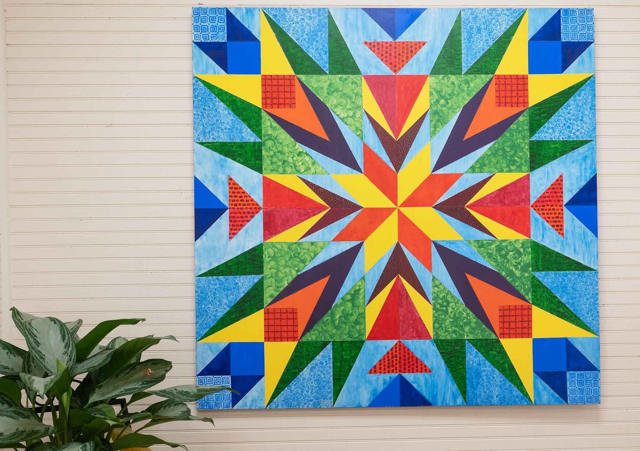 A ray of sunshine: Owners of The Rogue Skein opened their doors as a place of respite—and a listening ear—following the devastating floods that hit the community in July. This colorful barn quilt painting by Mary Thorp hangs at The Rogue Skein.