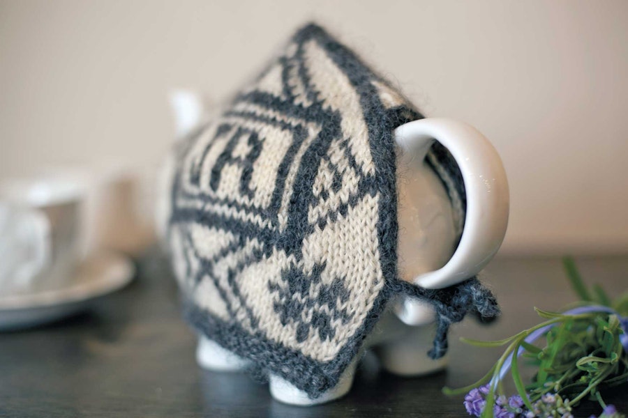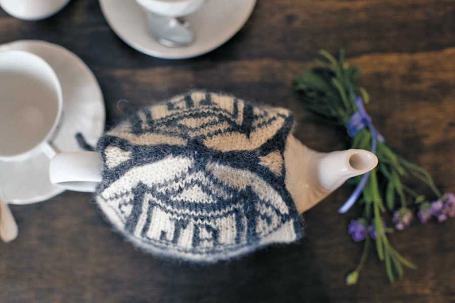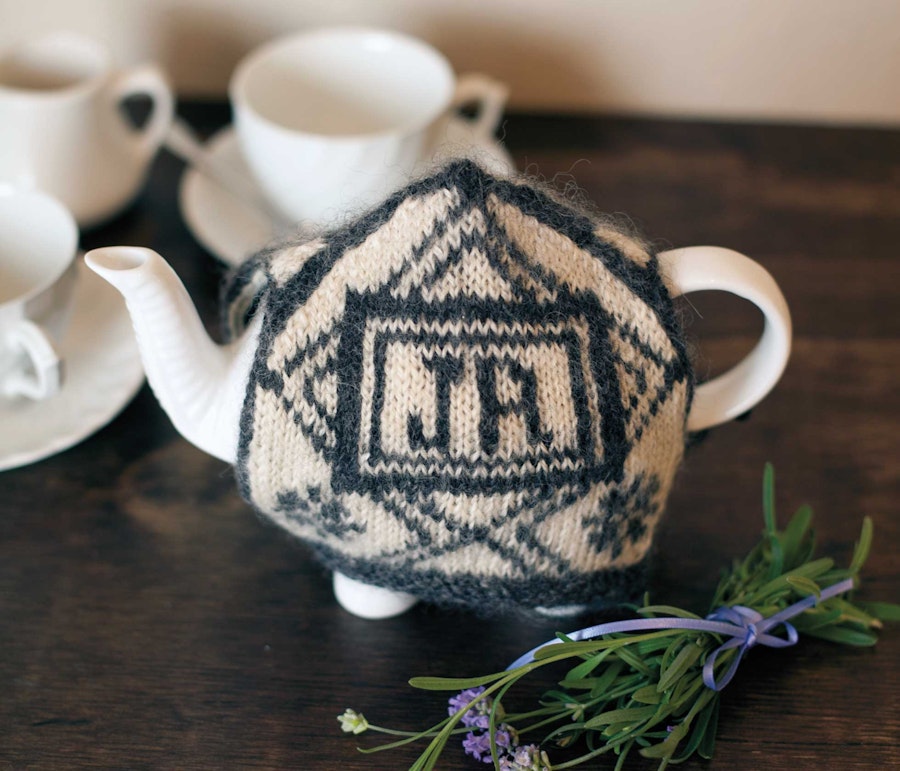 This cozy is inspired by Regency-era pinballs from the Victoria and Albert Museum collection, which you can visit online at vam.ac.uk. Using a stranded-knitting technique, the cozy is knitted in the round with steeks. This is a nice introduction to steeking, and you can use Jane’s initials, your favorite character’s, or your own.