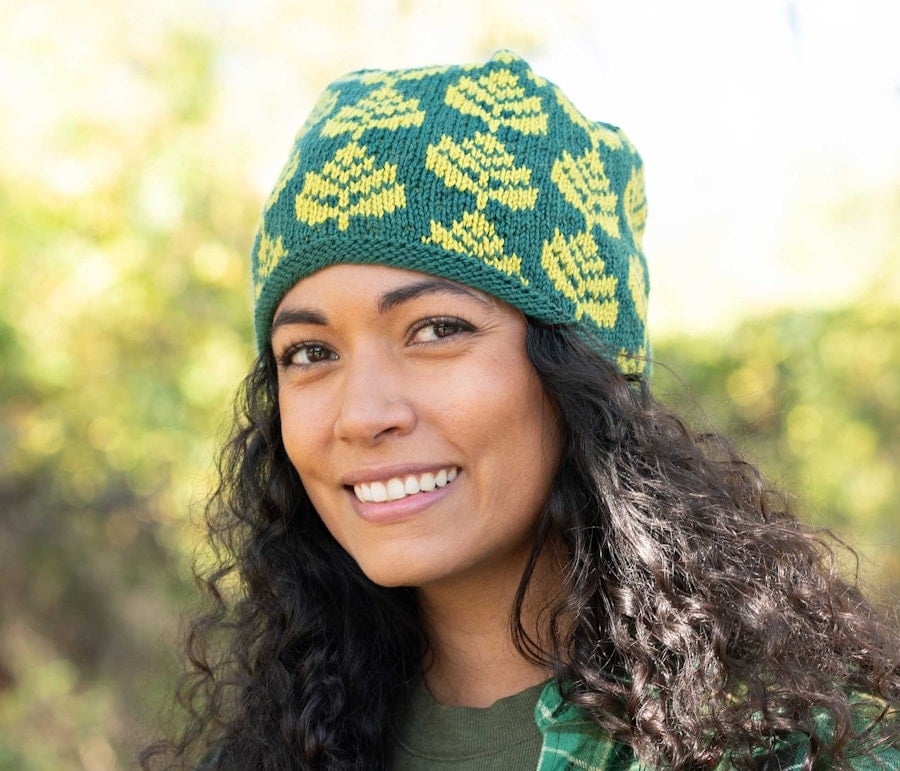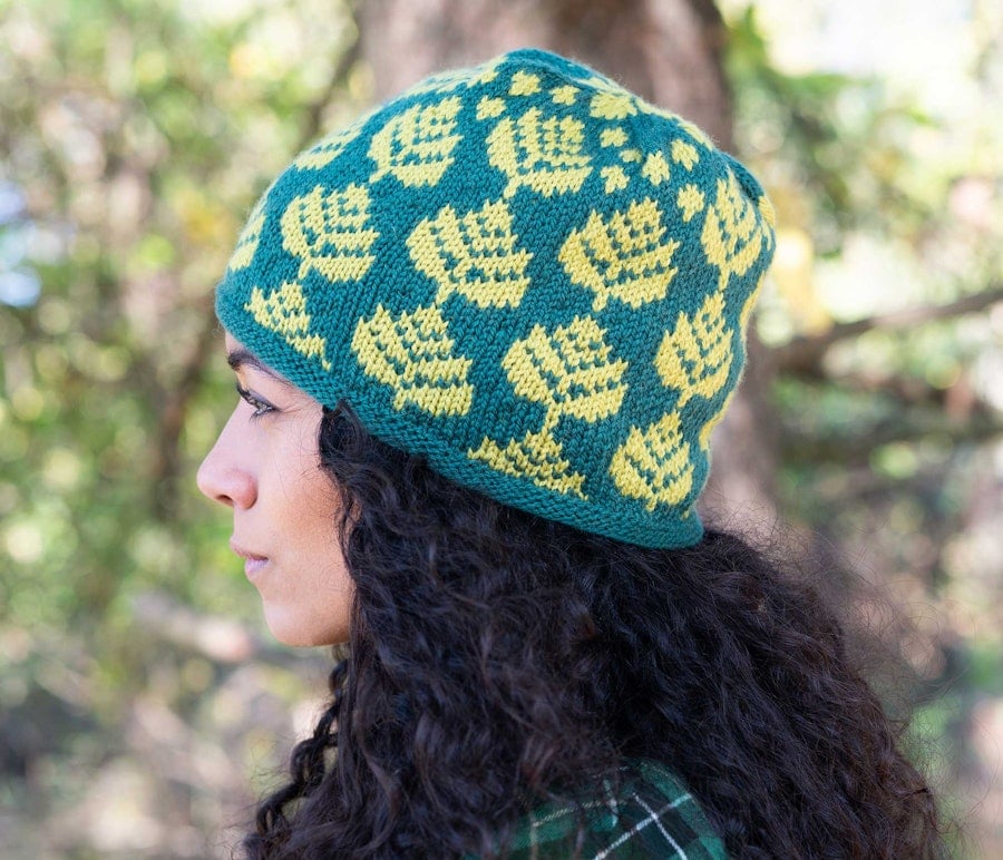 LoginWorked in the round from the bottom up with stranded colorwork leaf motifs, this beanie is an ode to leaves, the transition between seasons, and the process of photosynthesis. The stylized leaf is based loosely off the shape of the birch, Tanis’s favorite tree and the state tree of New Hampshire. The apex of the hat comes together to form a star motif, symbolizing the transfer of energy between the sun and the leaves that takes place during photosynthesis.