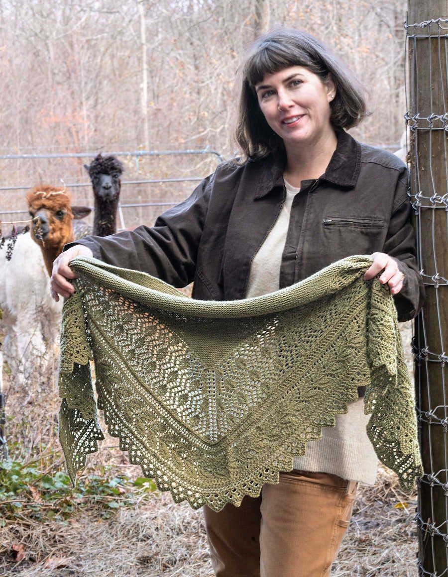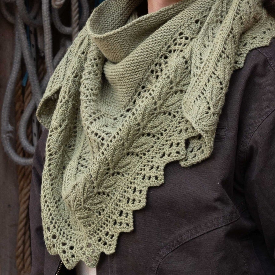 A change in needle size between the garter-stitch triangle and the lace edging helps the fabrics align and gives the finished piece an even, fluid drape. The leaf motif—shaped with eyelets and outlined by a purl column—adds movement and structure without feeling fussy. The Double Rose Leaf Border first appeared in Weldon’s in 1887, but it translates beautifully to modern yarns and sensibilities.