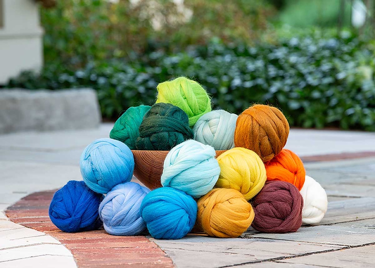 Brown Sheep’s dyed wool roving is perfect for felting and spinning.