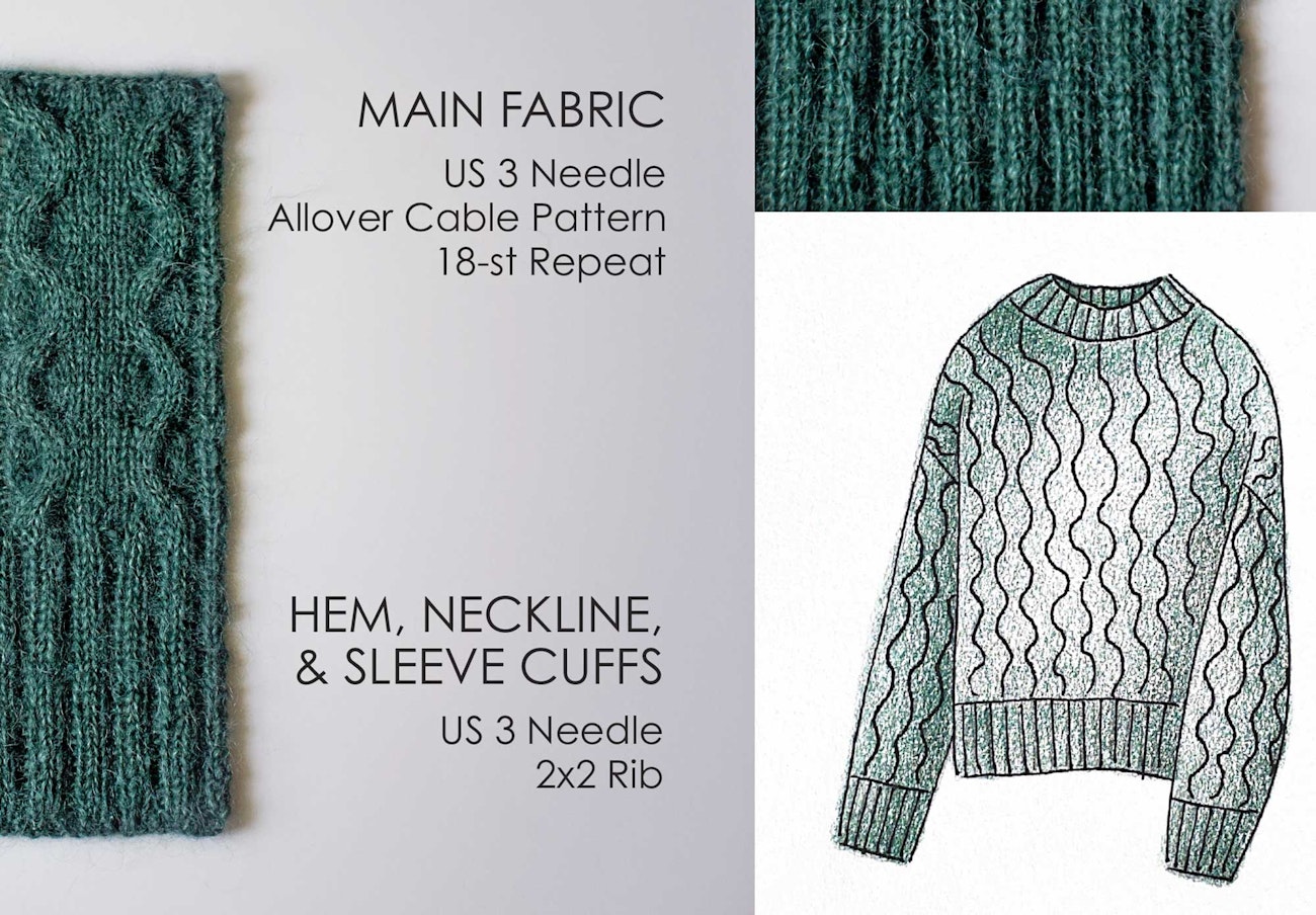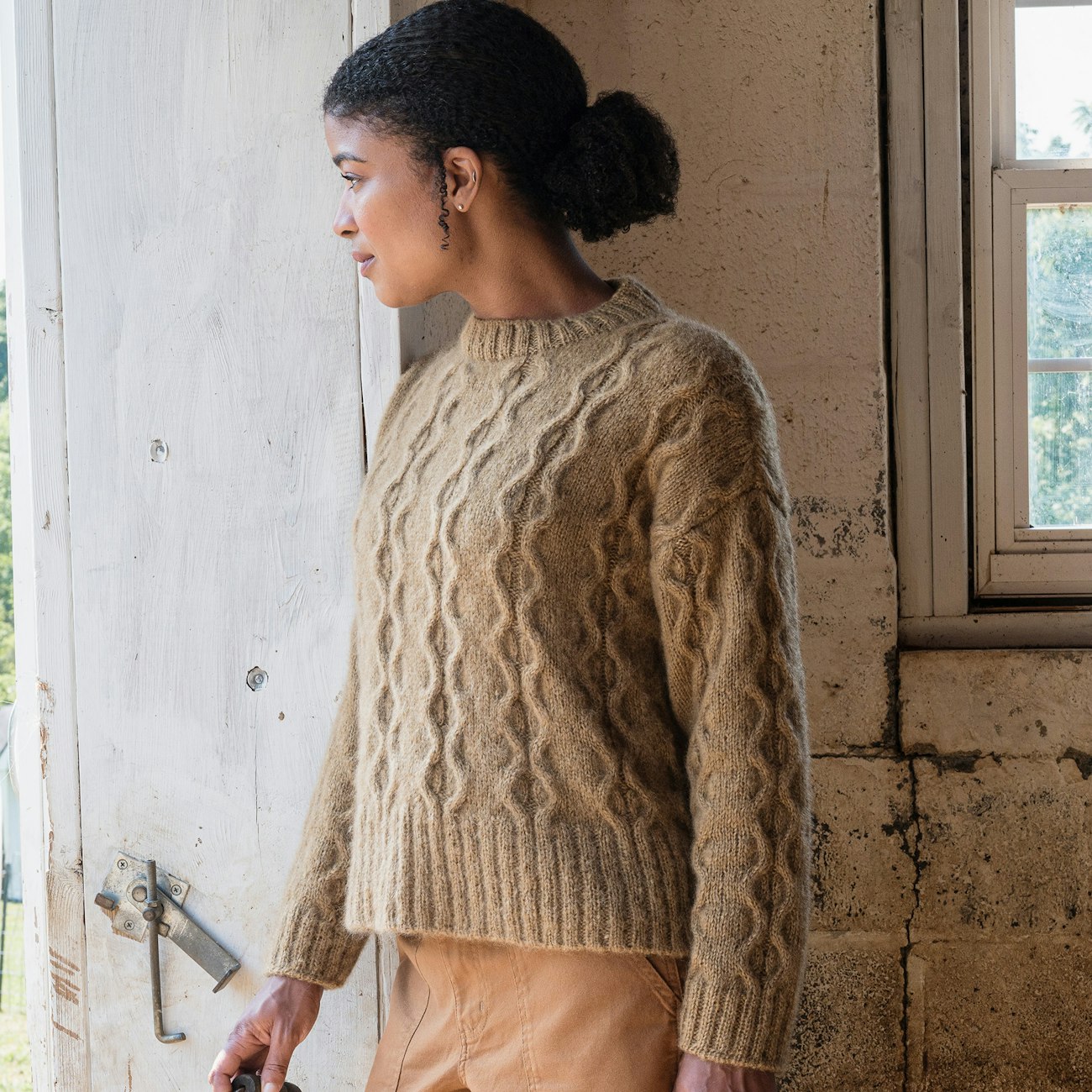 When Tayler Harris’s design proposal for a cabled mohair pullover came into the Farm & Fiber Knits submissions inbox, the editorial team just knew it was a winner. A classic silhouette swatched up in a luscious yarn, Tayler’s sweater checked all the boxes for a Farm & Fiber pattern: inspired by the natural world; fun-to-knit with a touch of challenge; a timeless style that will look as good in 10 years as it does today; gradable for a range of sizes; and knit in a yarn with a story.