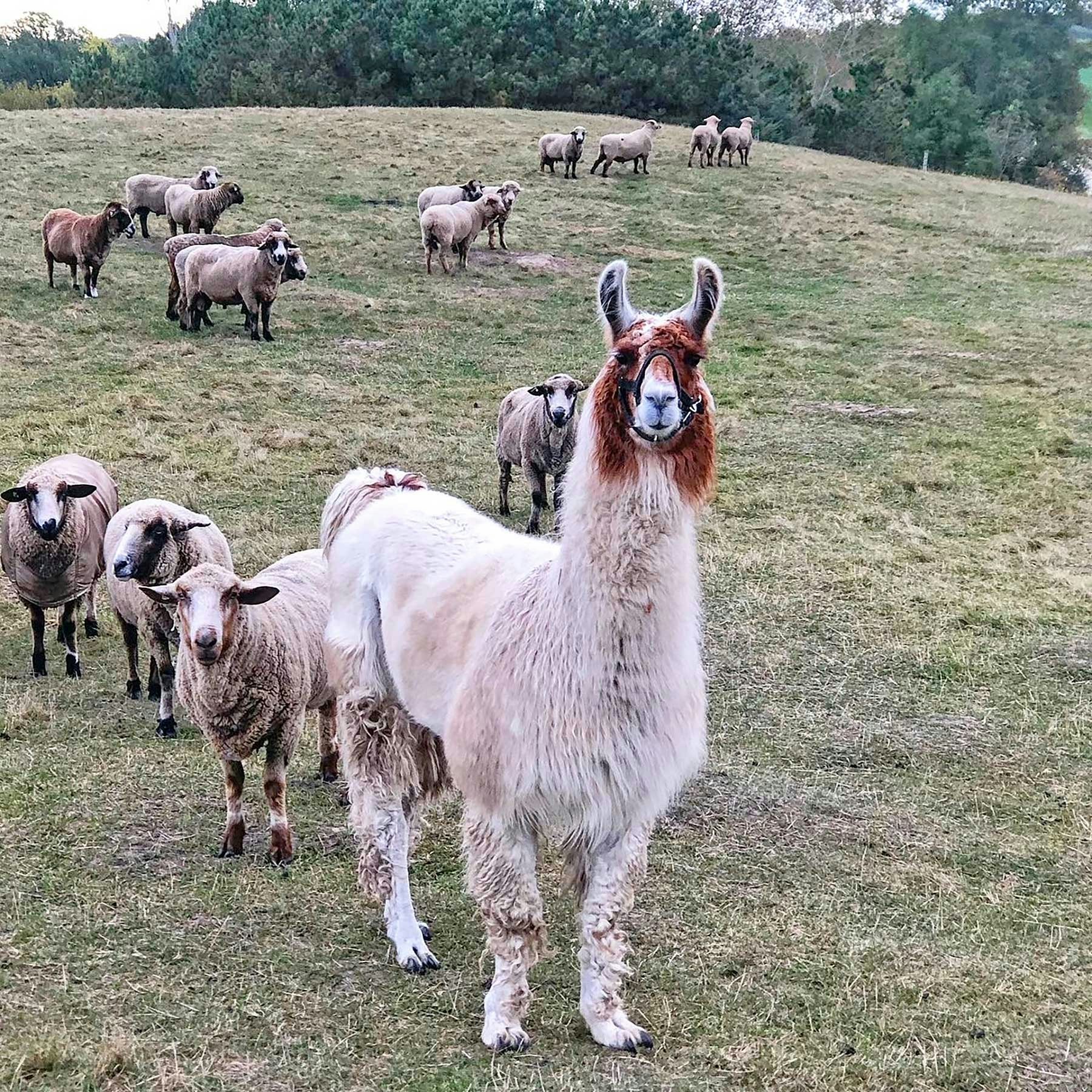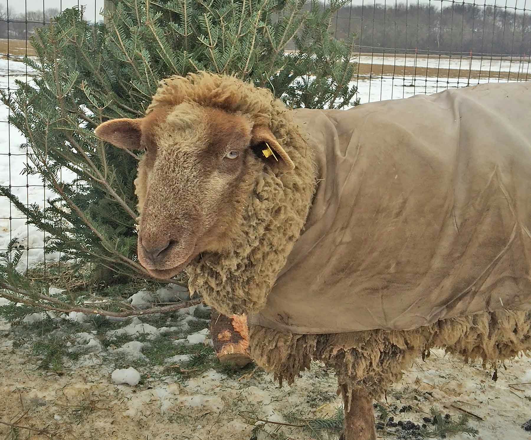 Founded by Diana Weinhardt-Treangen and her husband Dean in 2017, Harvest Hill Acres boasts a spacious fiber studio, about 100 Romeldale/California Variegated Mutant (CVM) sheep, and two guard llamas. All the sheep have names; Piglet, one of the original founding members of the flock, is a tiny ewe with a huge appetite for treats. You can see her below (top left image) in her coat, which helps keep her fleece as clean as possible. Effa, shown above, needed to be bottle fed, but would not take a bottle. According to Diana, “We had to tube feed her 4–6 times a day. Most lambs hate being tube fed, but not Effa! She would sit on my lap and tilt her head back, waiting for me to stick the tube down her throat, and stay perfectly still.”