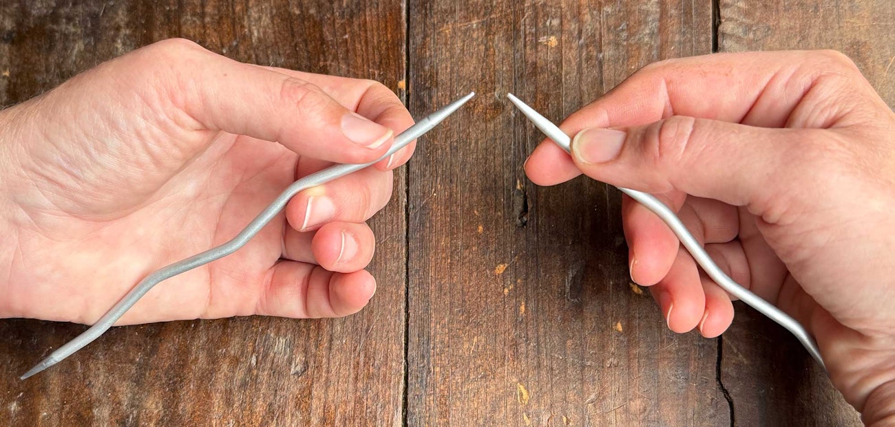 I didn’t like the shape undulations when working at a very tight tension, which wasn't surprising. These needles shine with average to loose tension. I was also surprised how quickly I settled into the shape. When working with DPNs, I hold the needle against my palm, using my middle finger—right where one of the serpentine bends is located. Here’s what it looks like while knitting: