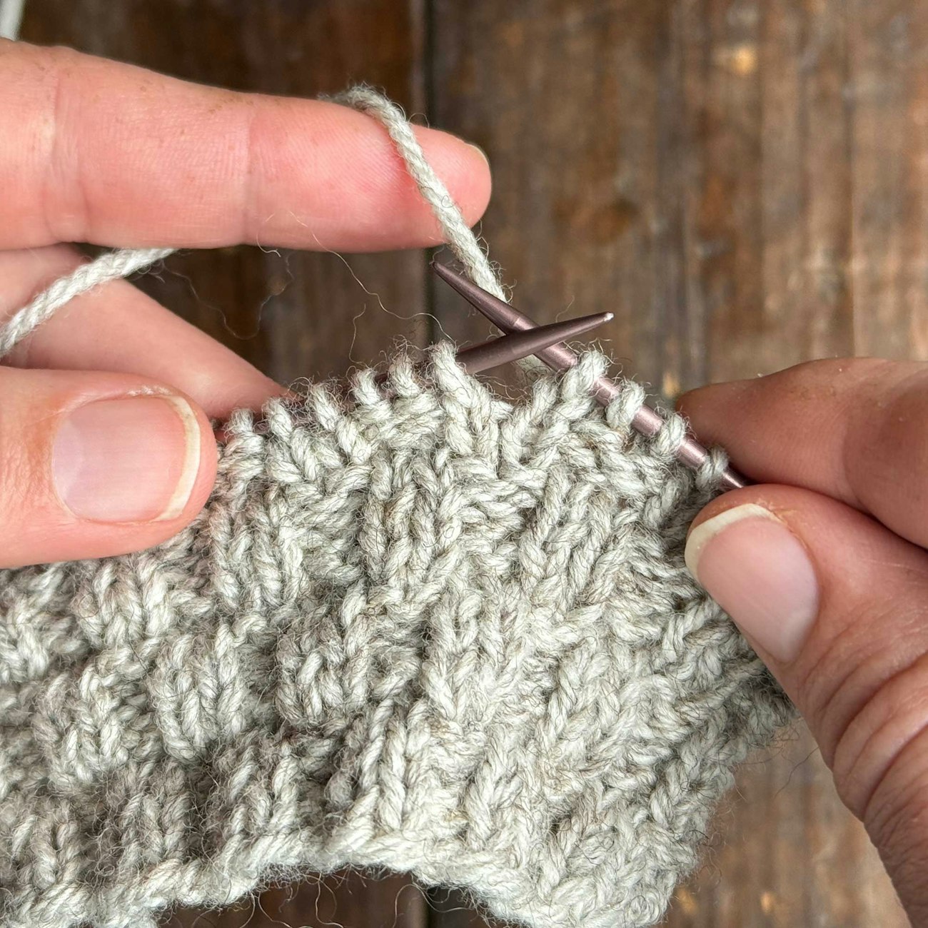 A tightly tensioned basketweave stitch using a DK-weight yarn and US 1 needles.