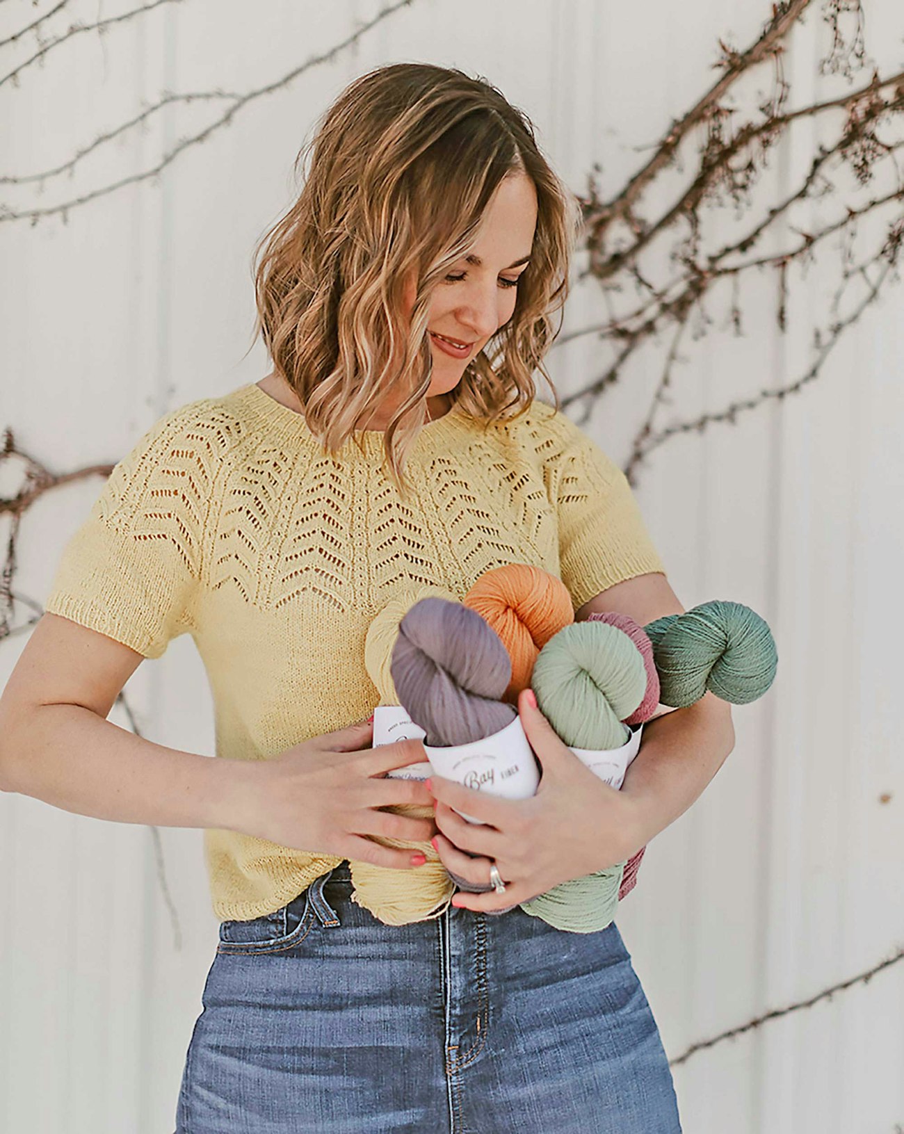 Jill holds skeins of North Bay Fiber Elemental Fingering while wearing her Bay Breeze Tee.
