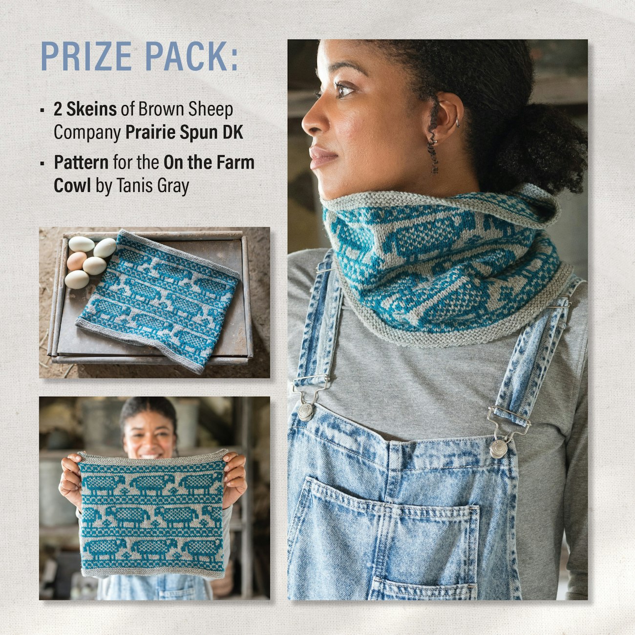 - (1) Prize Pack: 2 skeins of Brown Sheep Company Prairie Spun DK and a digital PDF copy of the On the Farm Cowl pattern. Retail value $38.00.