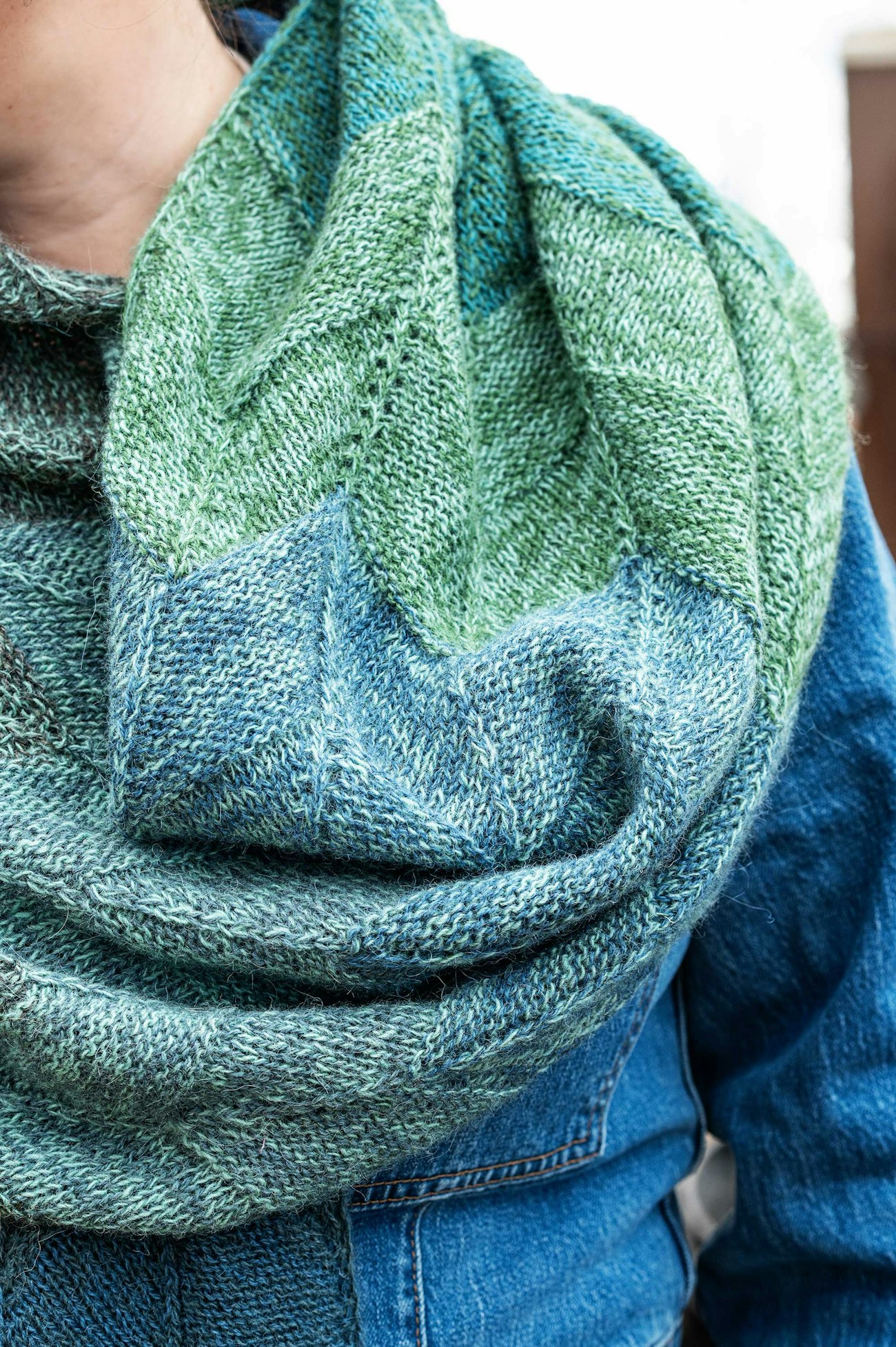 Cecelia is also exploring texture here. Starting with the yarns—Spinni and Alpaca 1 from Isager—she is working with a wool singles and a slightly fuzzy alpaca. This texture difference boosts the marled effect in this simple yet sophisticated chevron motif. Cecelia’s reversible chevron pattern not only complements the marled gradient, but it also makes this shawl easy to wear and enjoy.