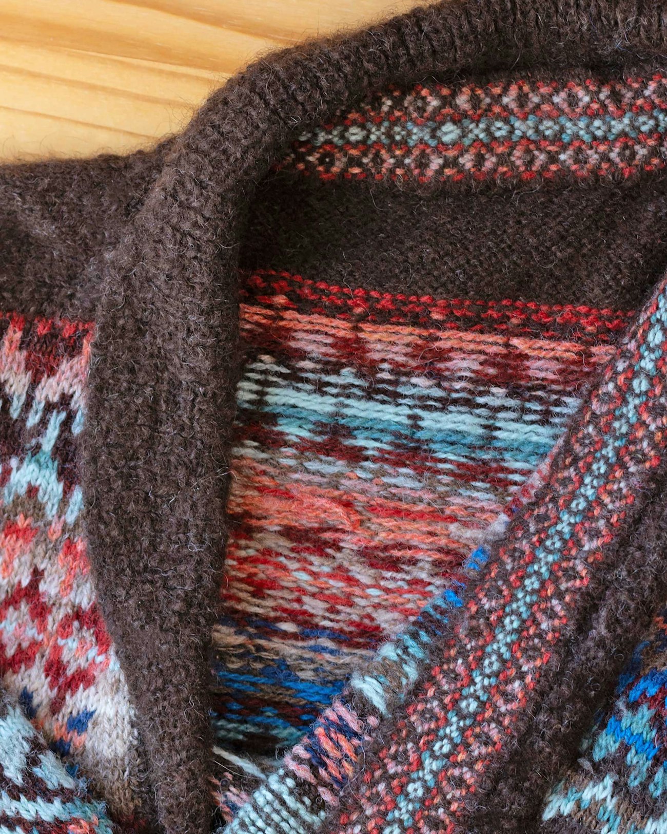 A well-finished neckline does more than look tidy—it helps a sweater hold its shape and stand up to years of wear. Whether you’re working with a steeked opening or simply want to prevent stretching, reinforcing the neckline adds a layer of durability where it matters most. Here, Pamela models a favorite handknitted cardigan, knitted in the round and reinforced with a woven band around the neckline.