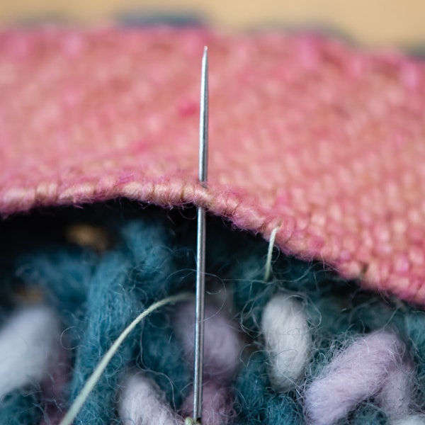 Step 3: Send your needle through a couple of loops of yarn on the back of your work. This is one of the few times it’s okay to split your stitches—the sewing thread should not show on the public side of the work.