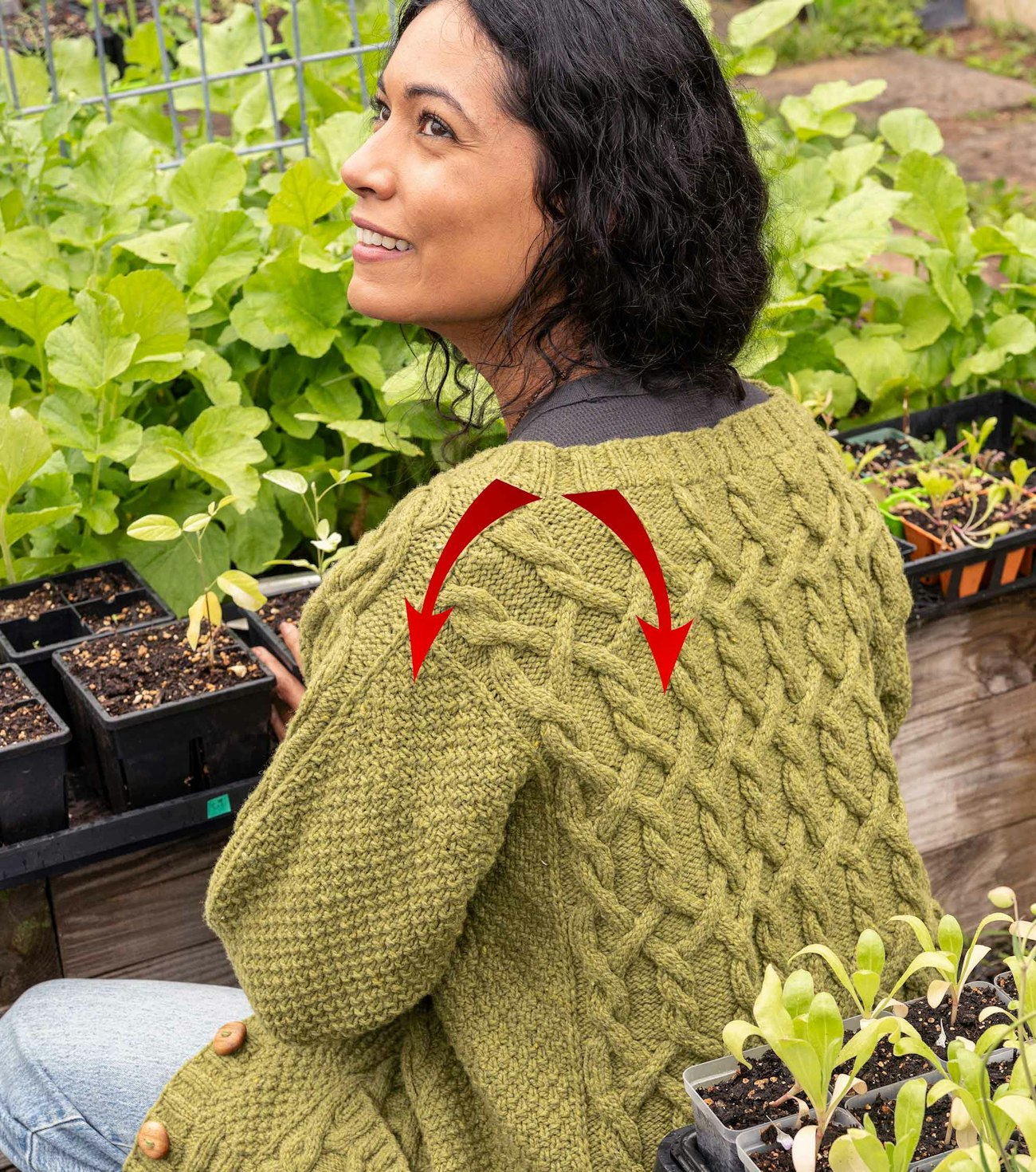 Not only is the weight of the sweater front and back supported by the shoulder and neckline, but the weight of long sleeves add horizontal tension on those same seams. If you’ve ever noticed that the sleeve length of a sweater or cardigan have become too long, or the point where the top of the sleeve meets the body is creeping down your arm, reinforcing the back neck (and possibly the shoulder line) can do wonders for fit.