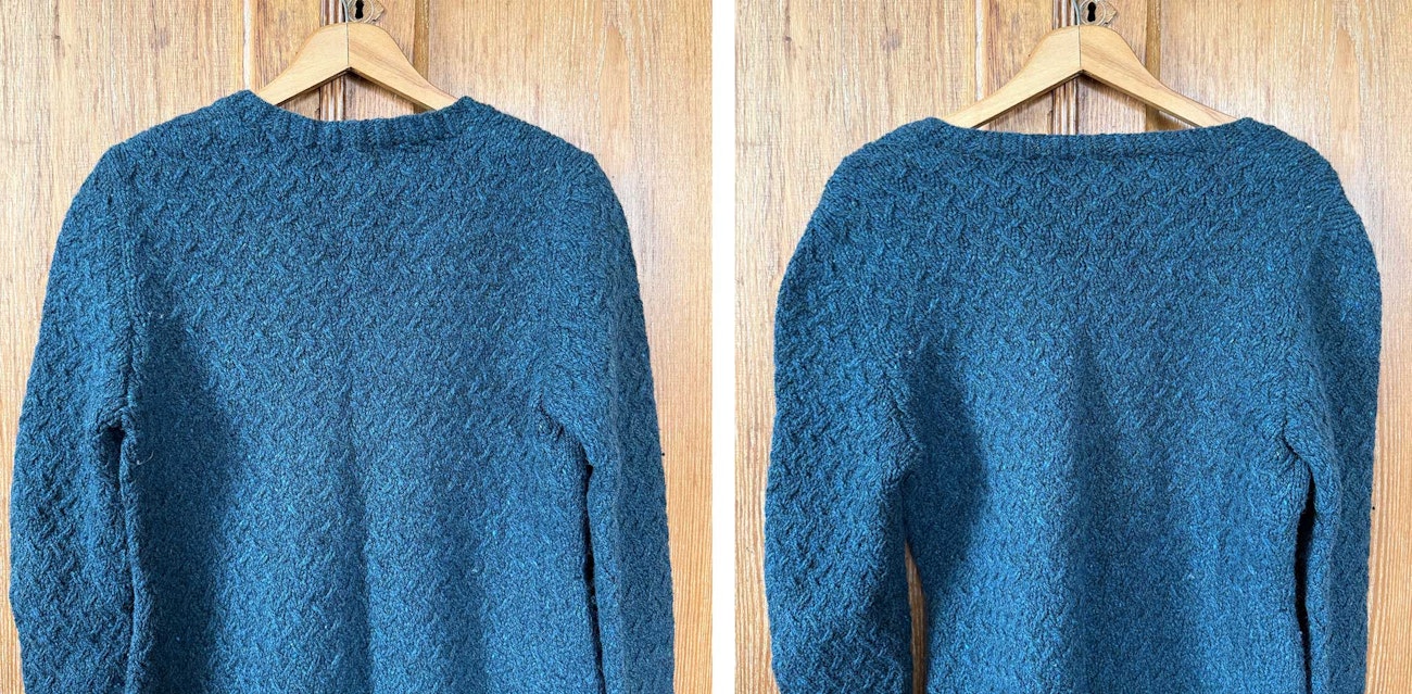 The back of Kate's sweater on a hanger: (Left) As originally designed, this sweater has a high neck with a nice back-neck curve. (Right) As the back neck stretches, the back-neck curve becomes long and shallow, allowing the shoulders to slip lower on the arms. This changes the fit in both sleeves and bust.