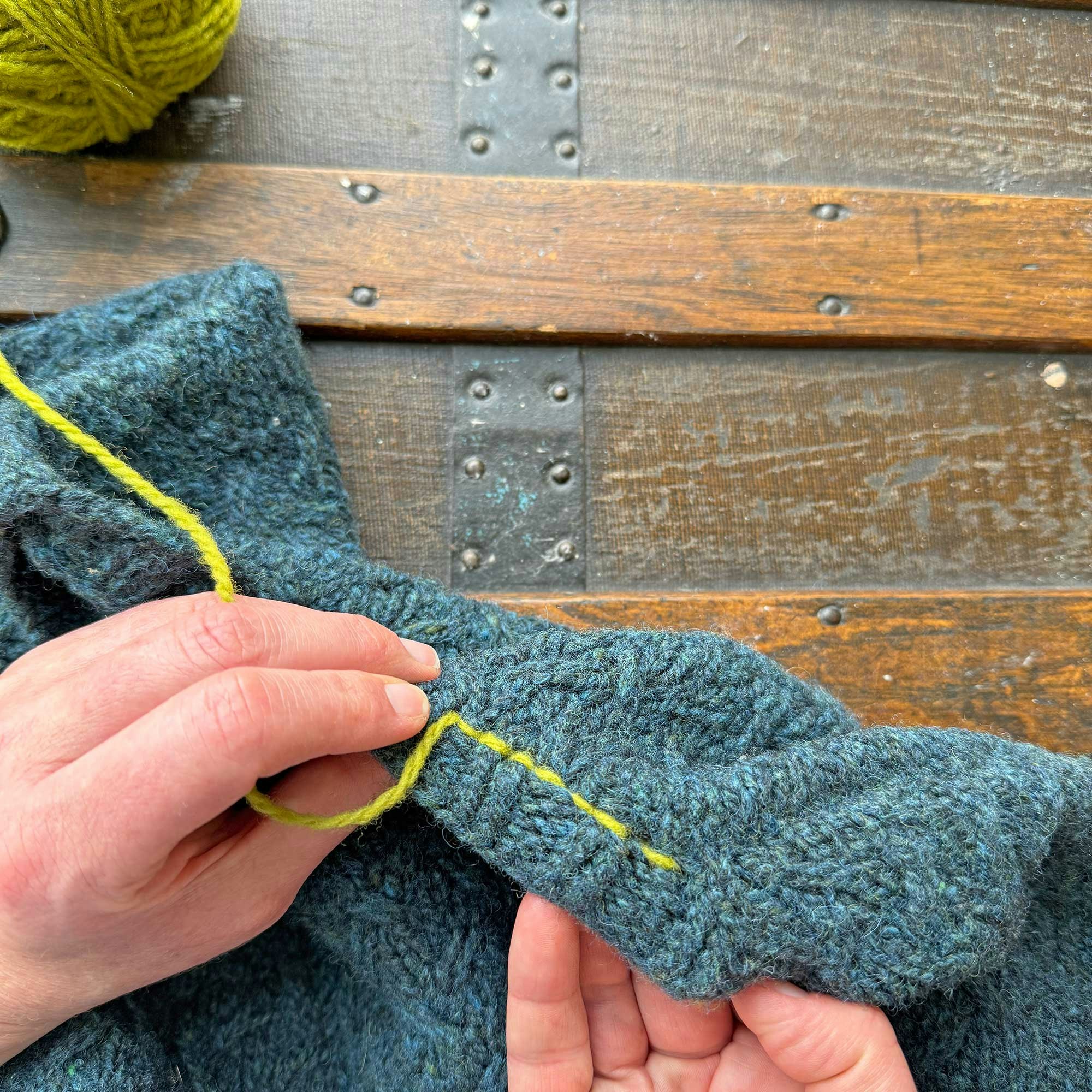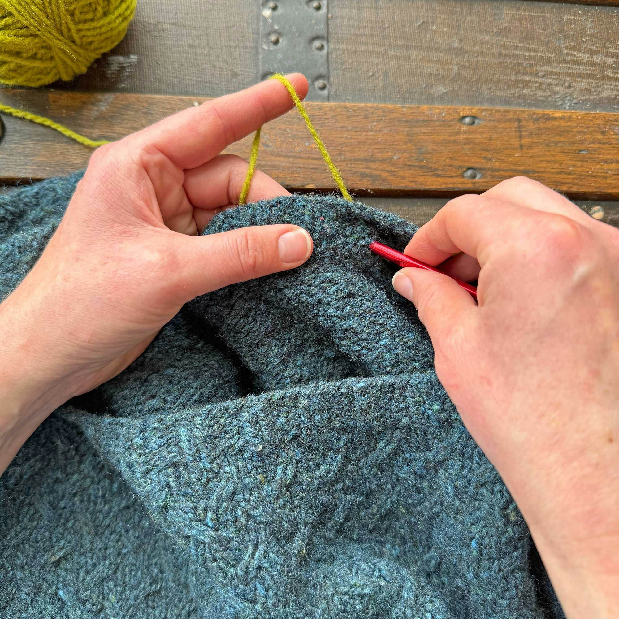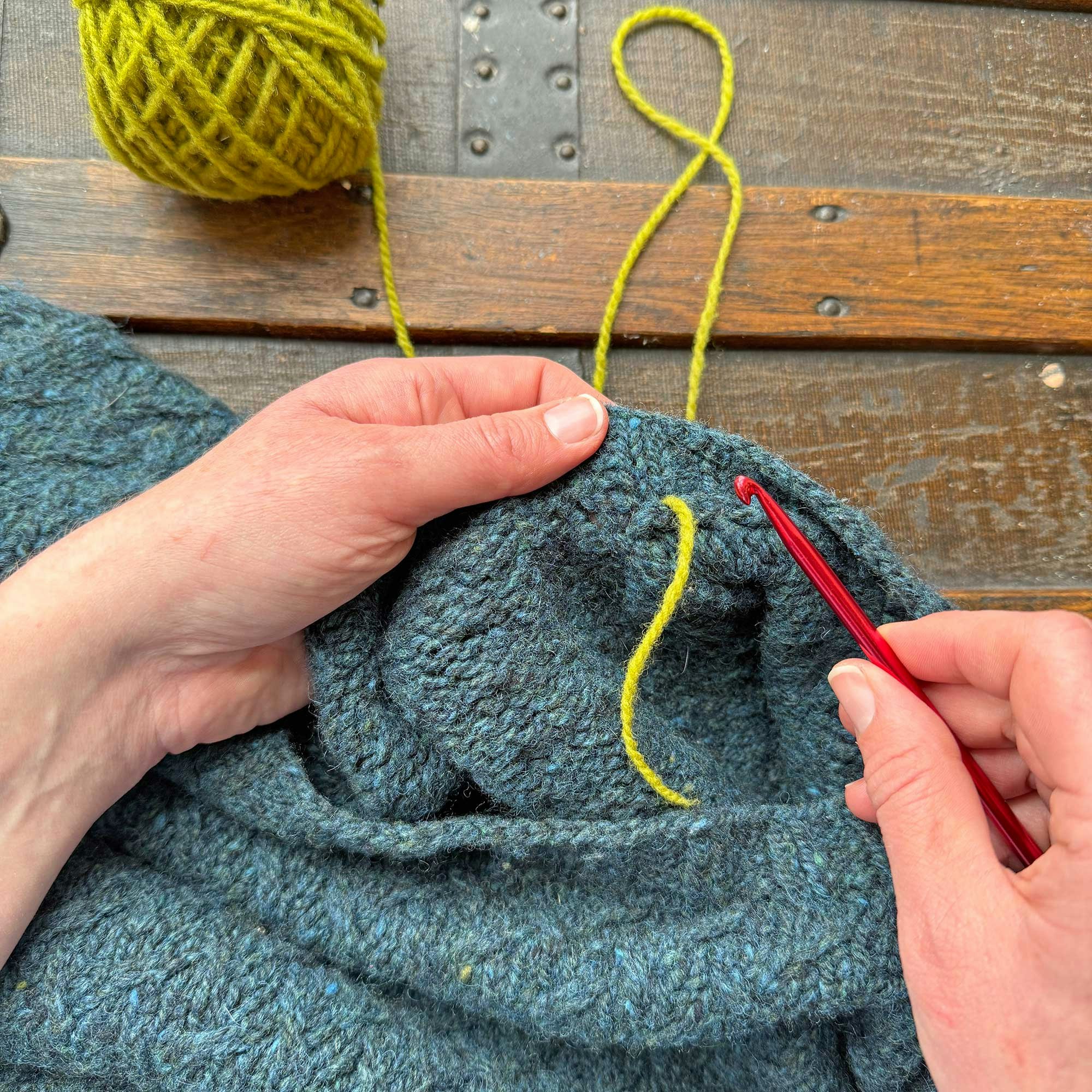 To show you how easily this extra support can be added, I pulled a sweater from my collection that didn’t have a reinforced neckline (yet) to demo step by step. My go-to technique is a simple crochet chain that can be a nearly invisible addition when worked in the same yarn as the sweater, or it can be a way to add a fun pop of color.