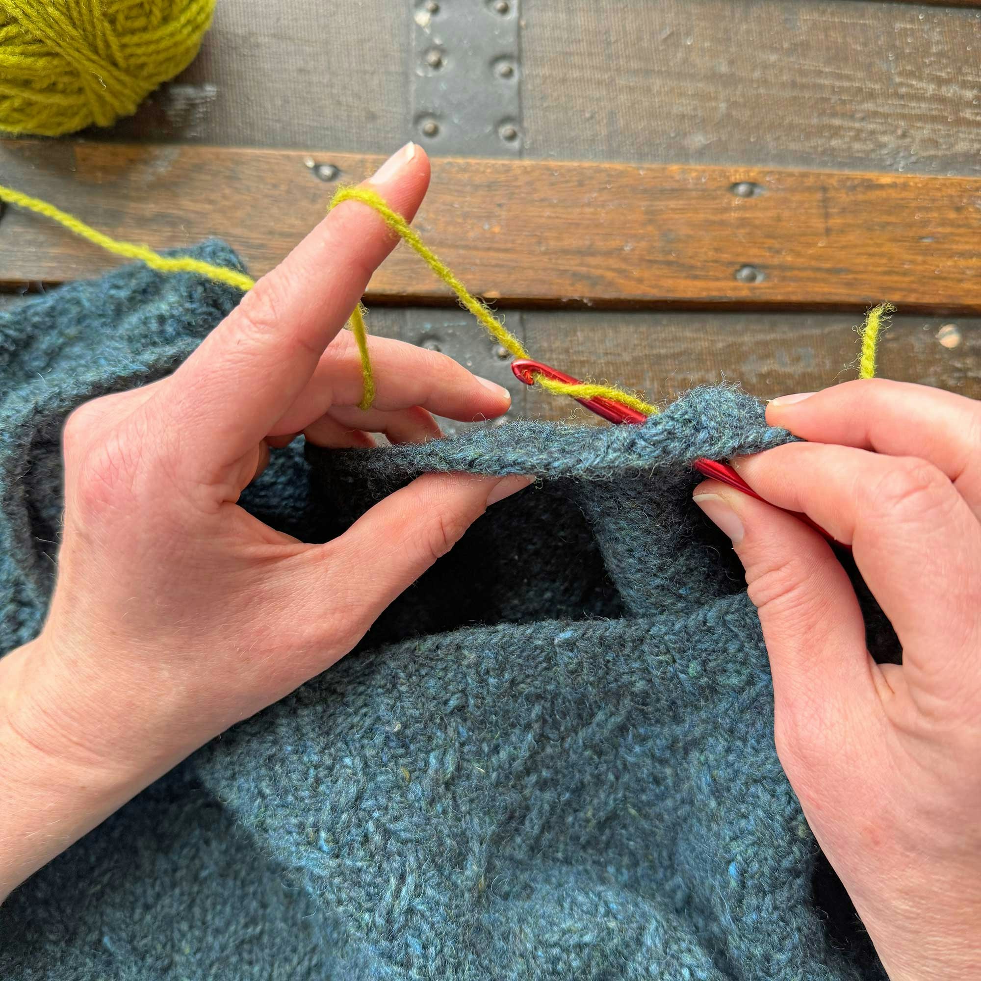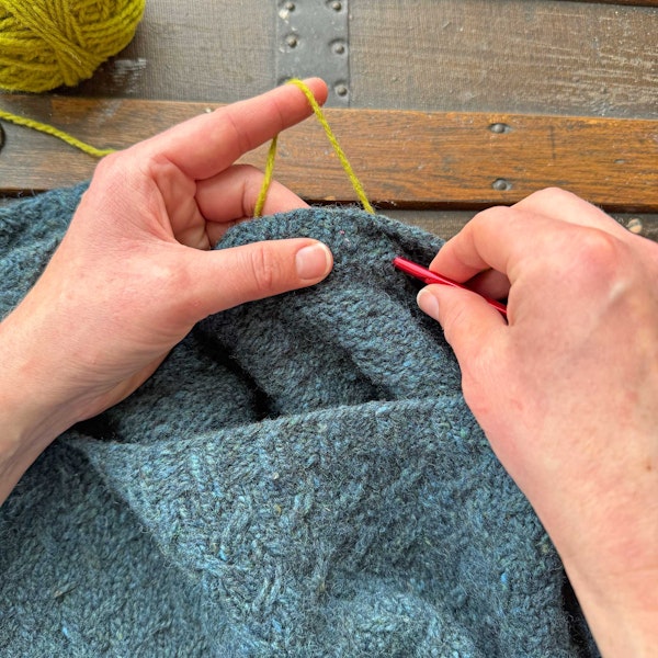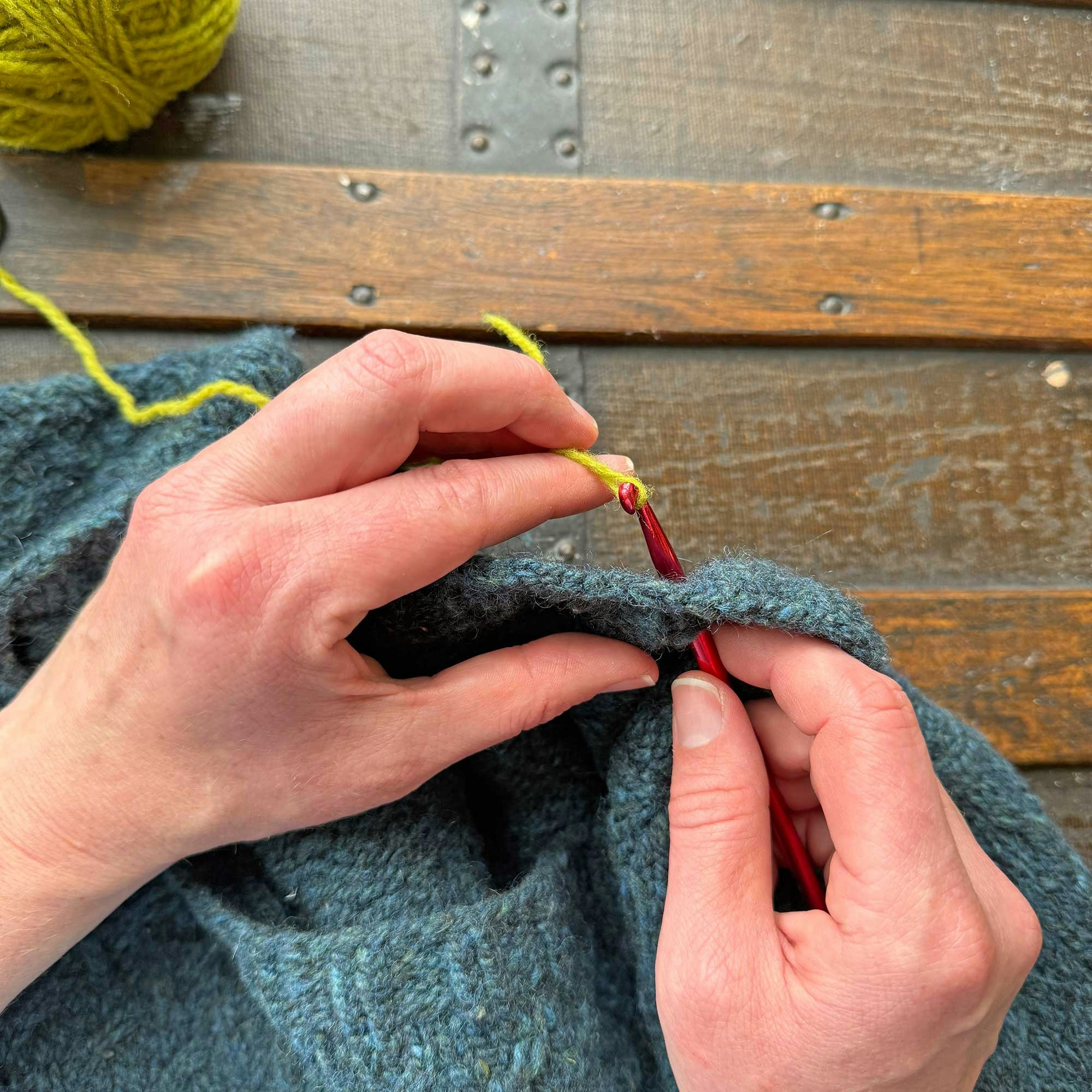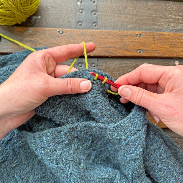 Step 10: Occasionally check the other side of the work (which is the RS of the sweater) to make sure the row of chain stitches is tidy.