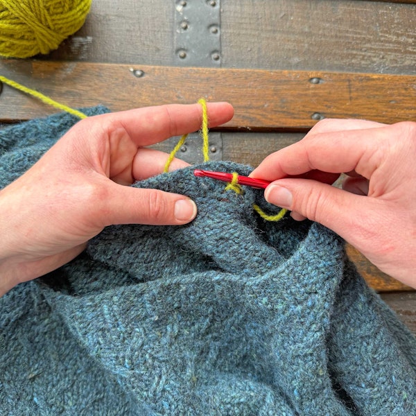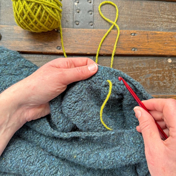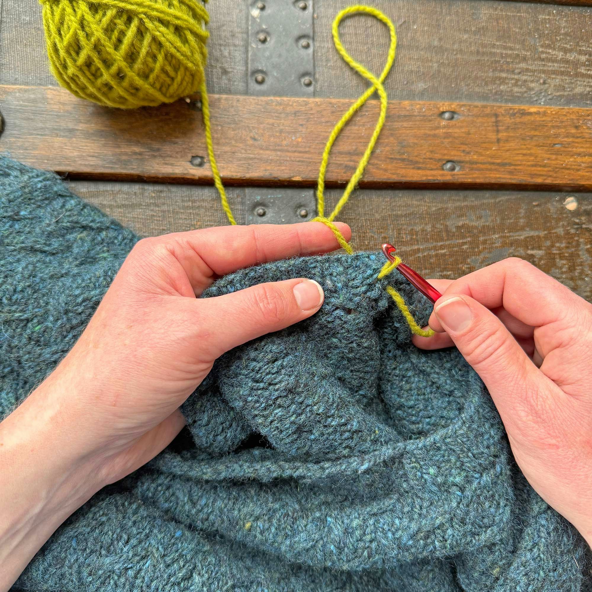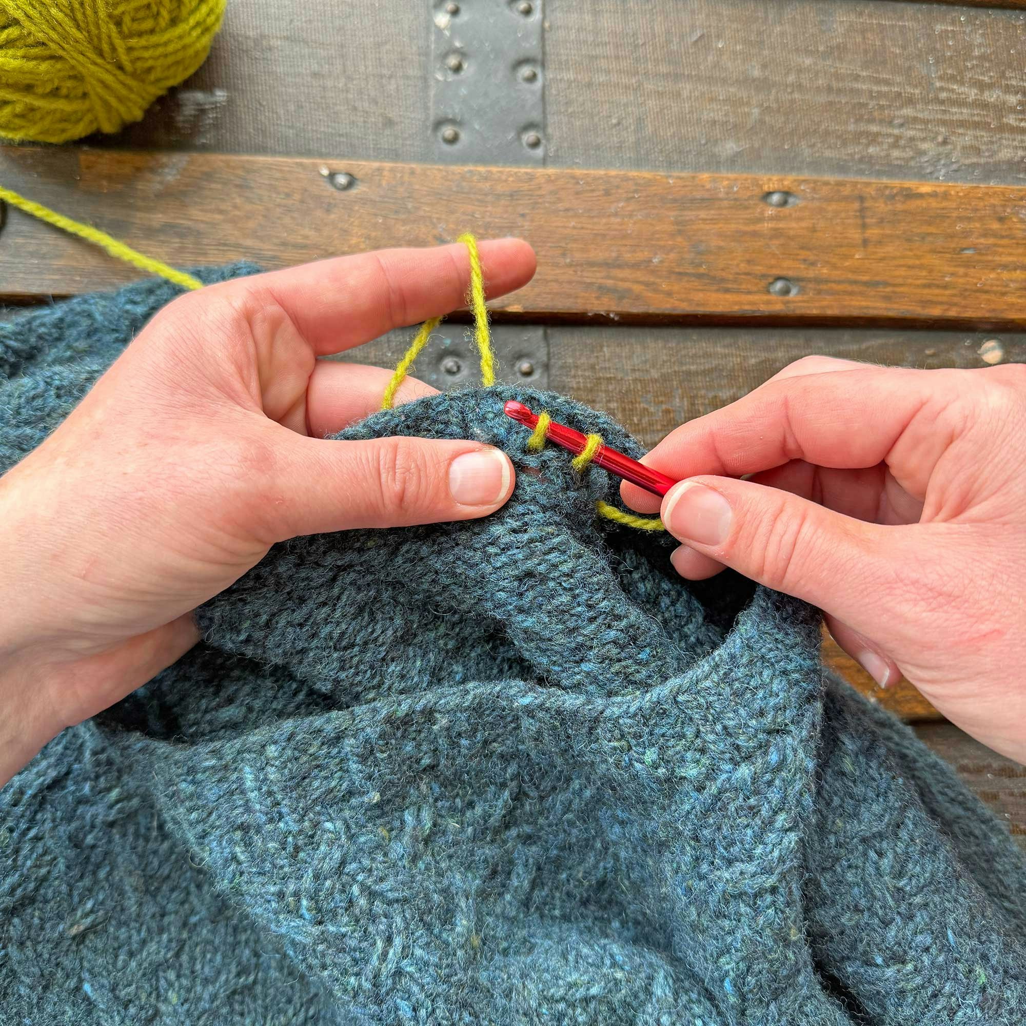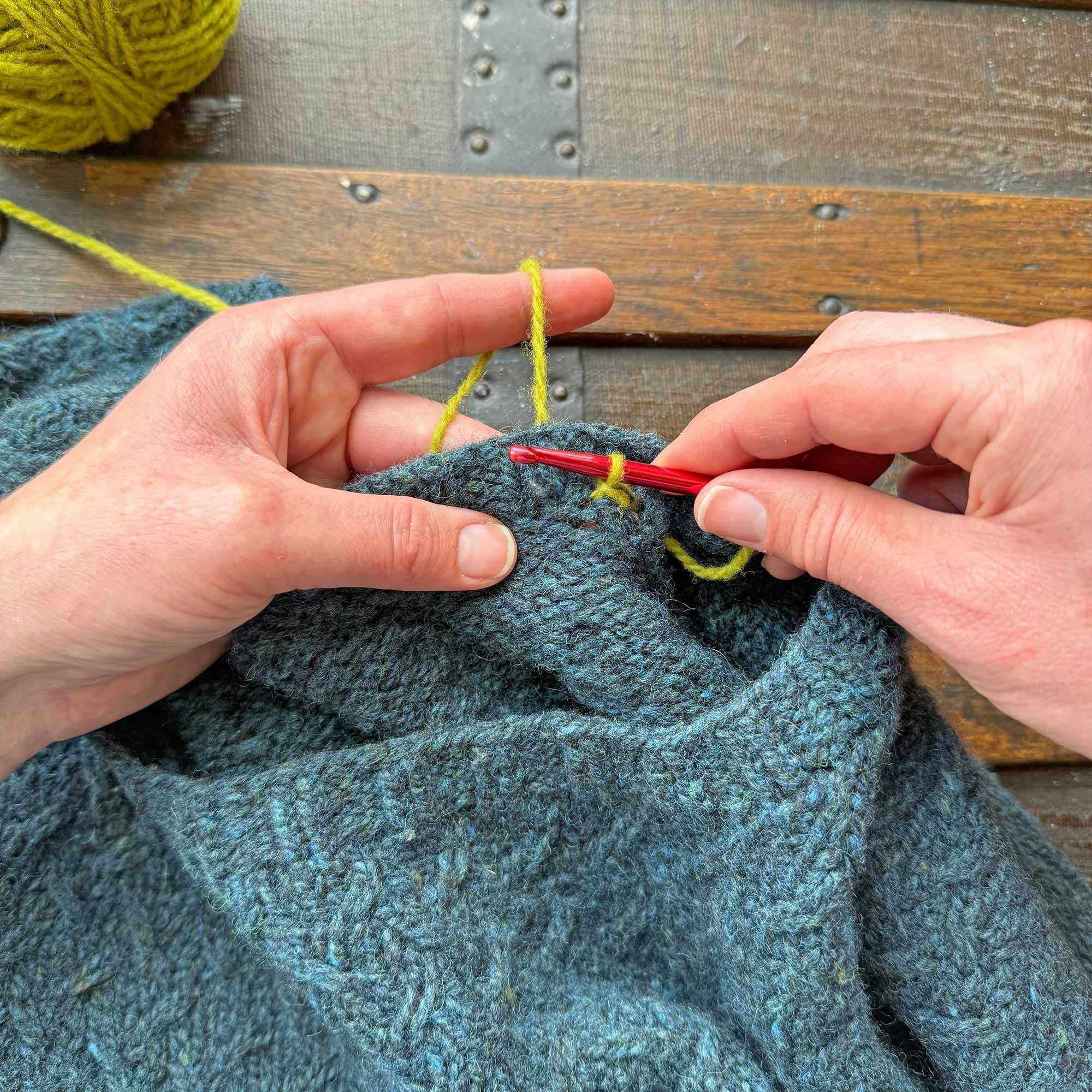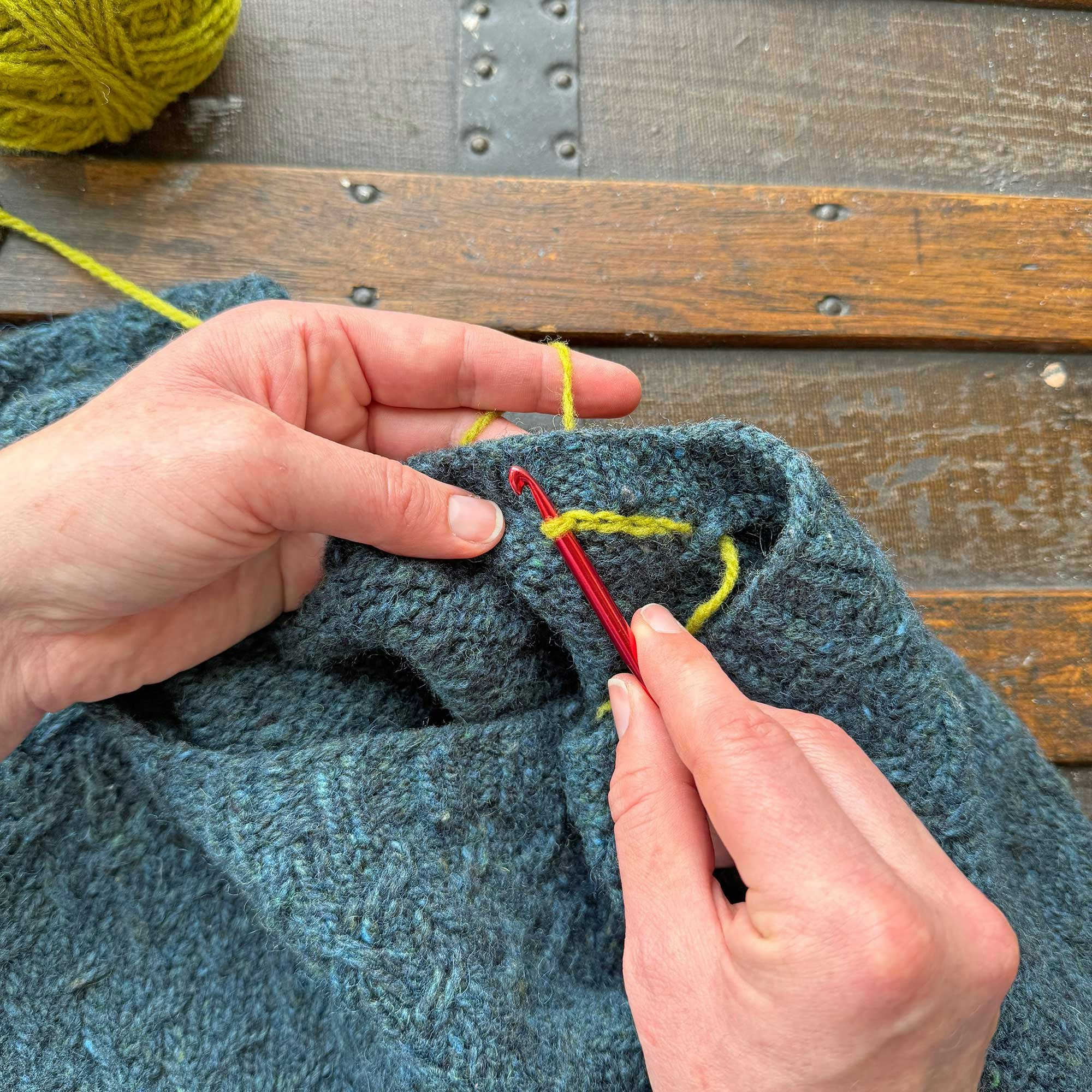 Again, I used a contrasting color for the crochet chain here so you could see it more easily. By using leftover yarns from the sweater, you can create a nearly invisible finish. I hope you'll give this a try!