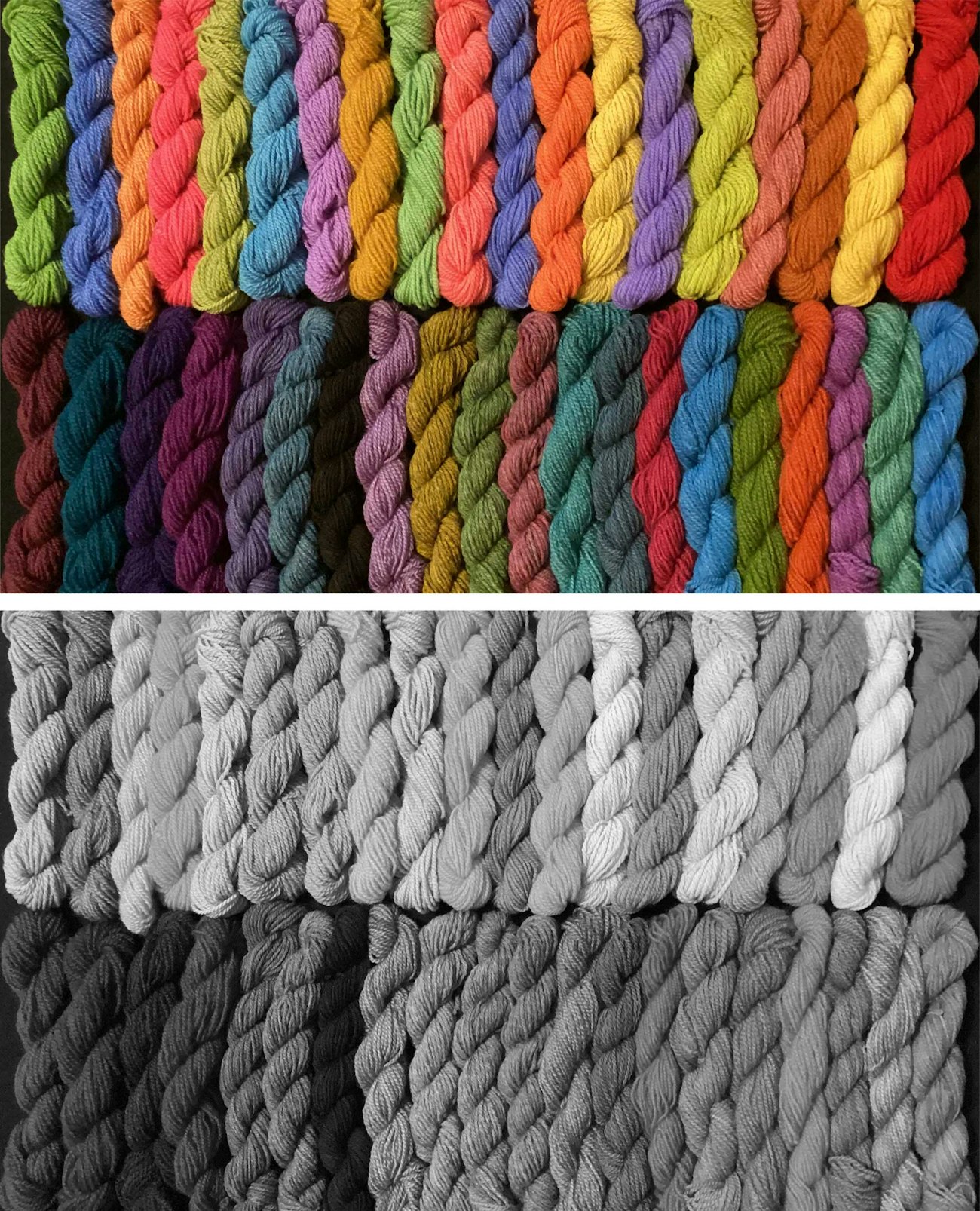 The more I think I understand about color, the more experience proves me wrong, but here are my thoughts anyway. Color relationships—primary, secondary, tertiary, complementary, analogous, and so on—are important. However, the interaction of dark and light colors is also important. To create contrast, it’s helpful to determine the value—lightness or darkness—of your colors. An easy way to do this is to lay out your yarn, snap a photo, and then edit the image saturation so that it appears in gray scale. If you have a black-and-white filter, this is even faster. When looking at the image in black and white, it’s easy to pick out the very dark yarns. You may be surprised, as I was, that colors thought of as dark turned out to have medium value. Some colors, such as orange, frequently surprise me.
