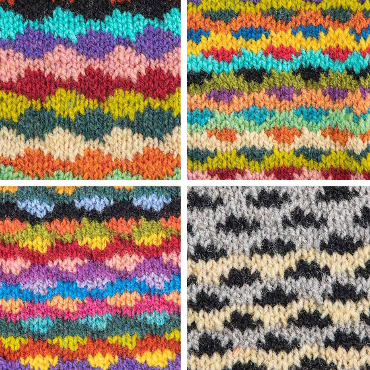 For this knitting pattern (and many other colorwork patterns) to work, a palette of colors with good to very good contrast is what keeps the eyes dancing, but that limit can be stretched. It isn’t necessary to use only light and dark colors; you can use medium shades, too. The main thing is to have enough contrast in the slip-stitch rows so that they stand out