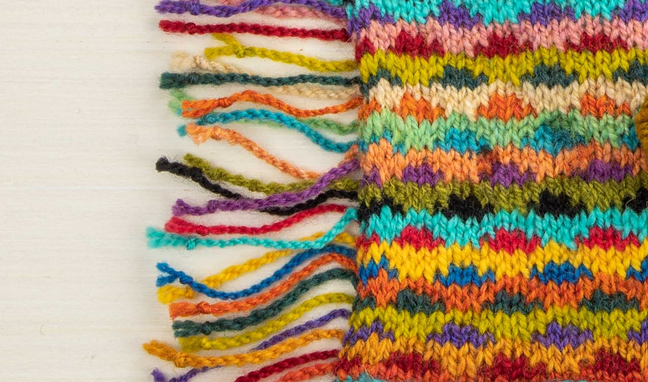 Changing colors frequently while knitting means that there will be many ends to weave in or manage in some other way. A flat fabric such as a scarf could be worked horizontally, and all those glorious ends could be turned into twisted fringe. I used this method on some of my swatches and found that it controlled the side curl well. If the pattern is worked in the round, yarn ends could be knotted and hidden inside. Others have done it; you can, too. Also, if working circularly, consider starting each color in a different spot than the previous color. That way, the knots will be scattered throughout rather than creating a line of bulk.