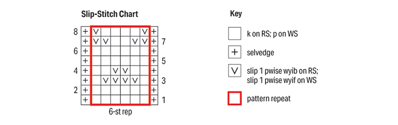 Like all slip-stitch patterns, this pattern is row dense. For every complete pattern repeat (eight rows), only six rows are visible in the knitting. This is important to know when you are counting for your row gauge. The good thing is that the slip-stitch rows go a bit more quickly than the knit rows.