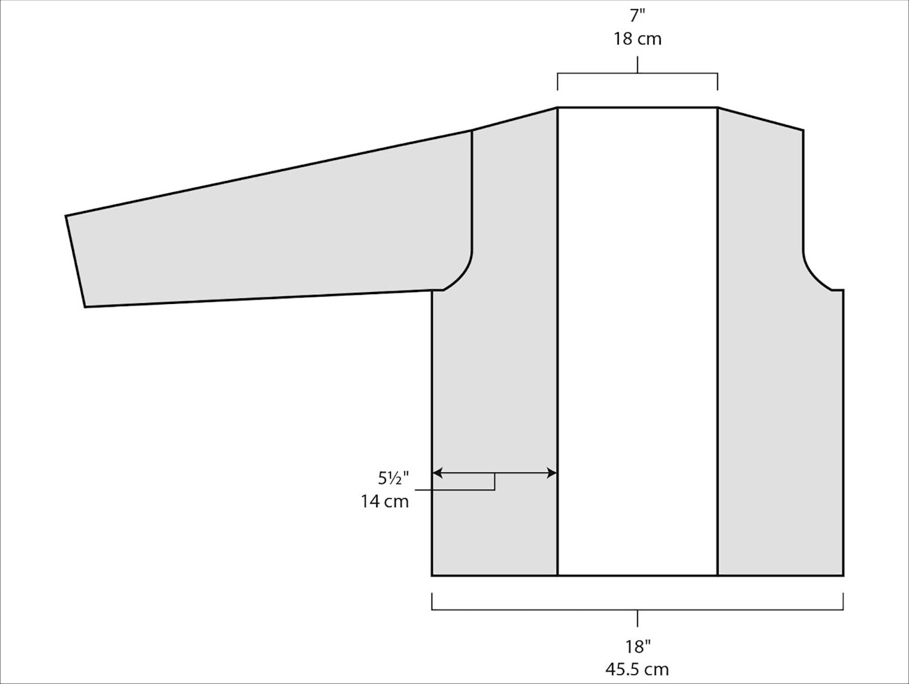 For example, let’s look at this cardigan. The back measures 18" wide, and each front measures 5½" wide. The sweater itself measures 5½" + 18" + 5½" = 29".