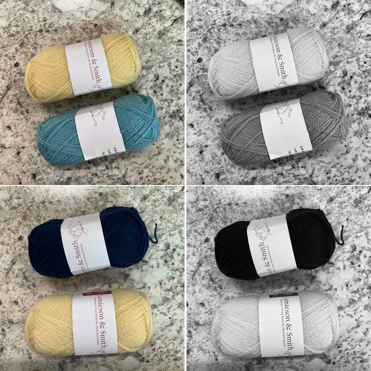 Skeins shown in color and grayscale. Which pair do you think will pop more in a motif?