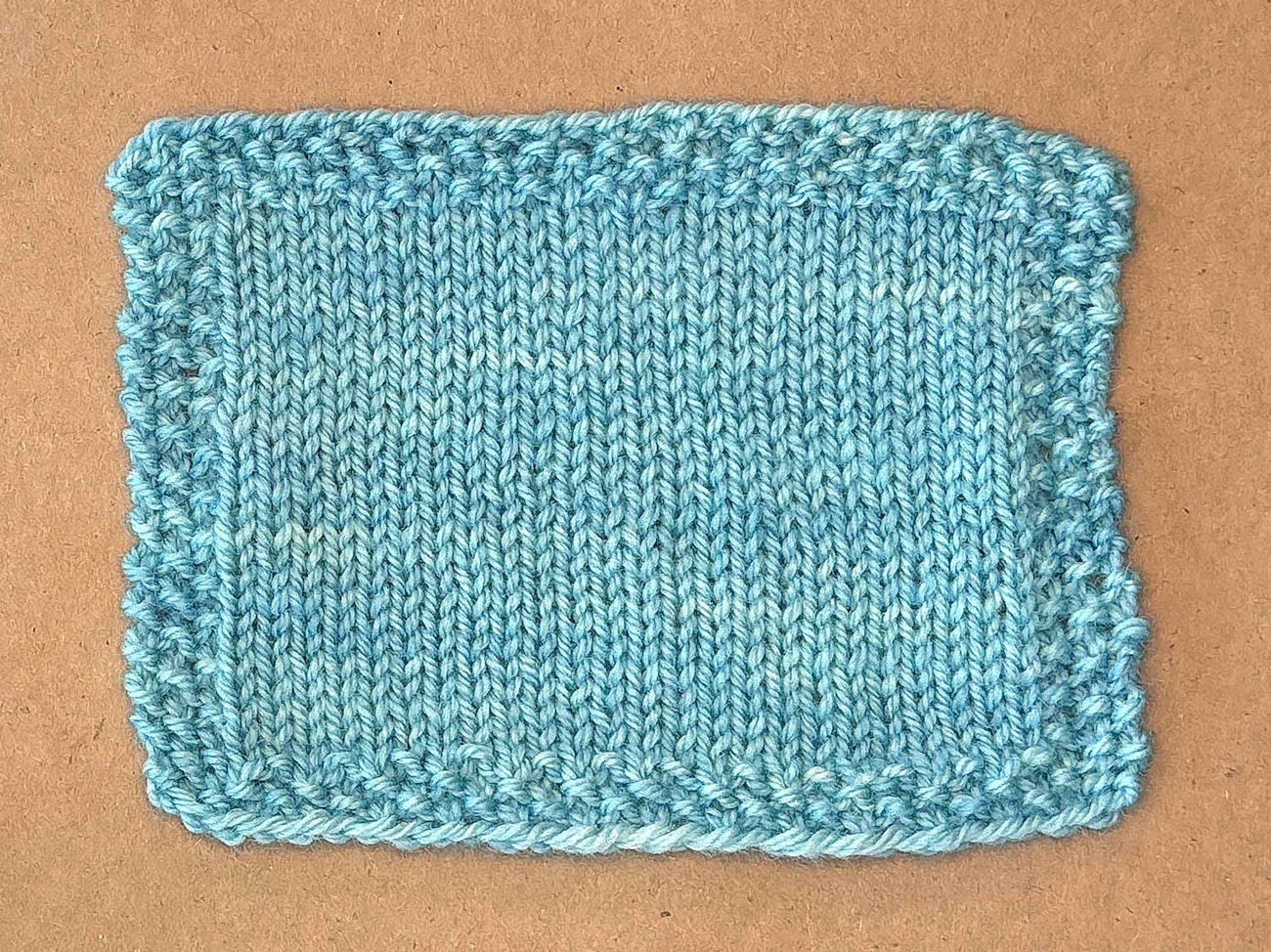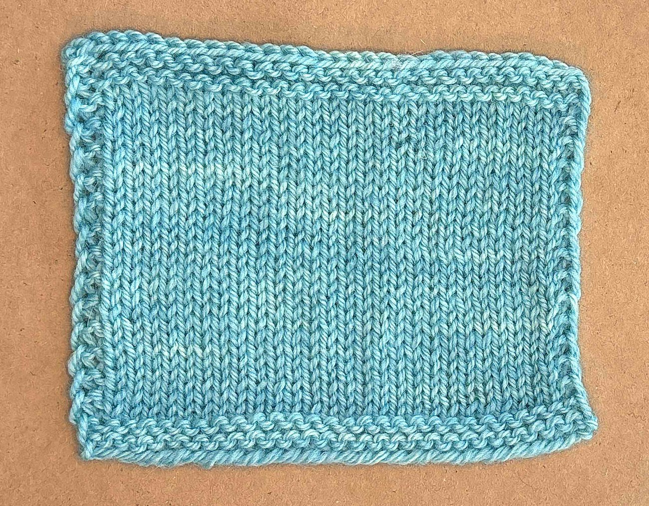 The first three and last three stitches of each row were worked in garter stitch, preventing curling. But sides of the swatch are shorter than the center.