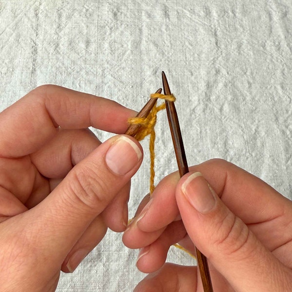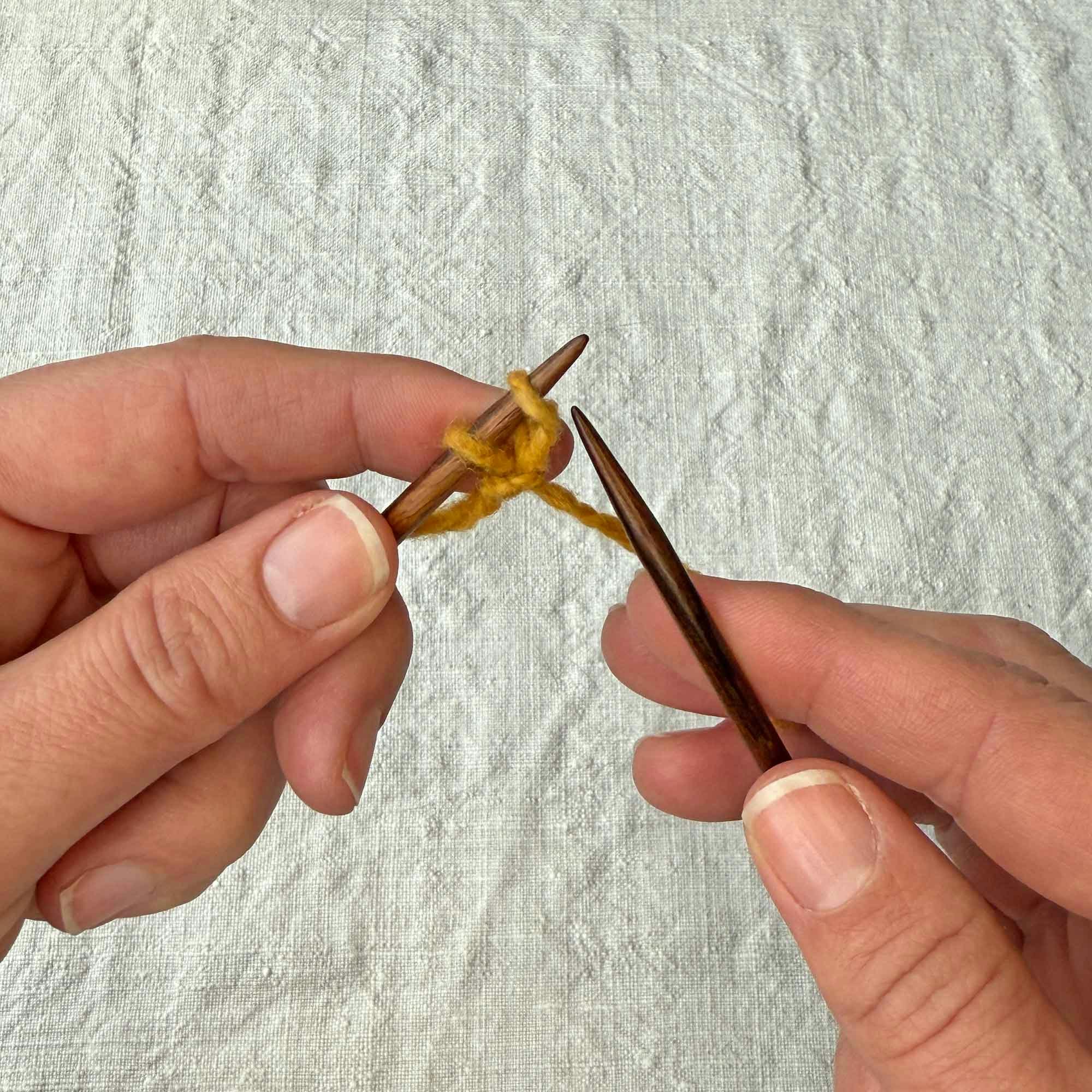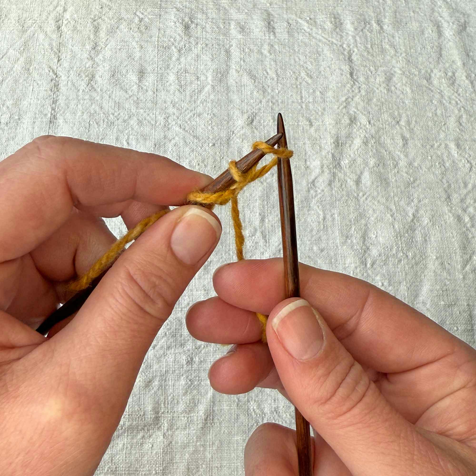 Begin to knit into it as if it were a normal stitch. (I’m holding the working yarn in my right hand here, but the technique is just the same if you prefer using your left hand.
