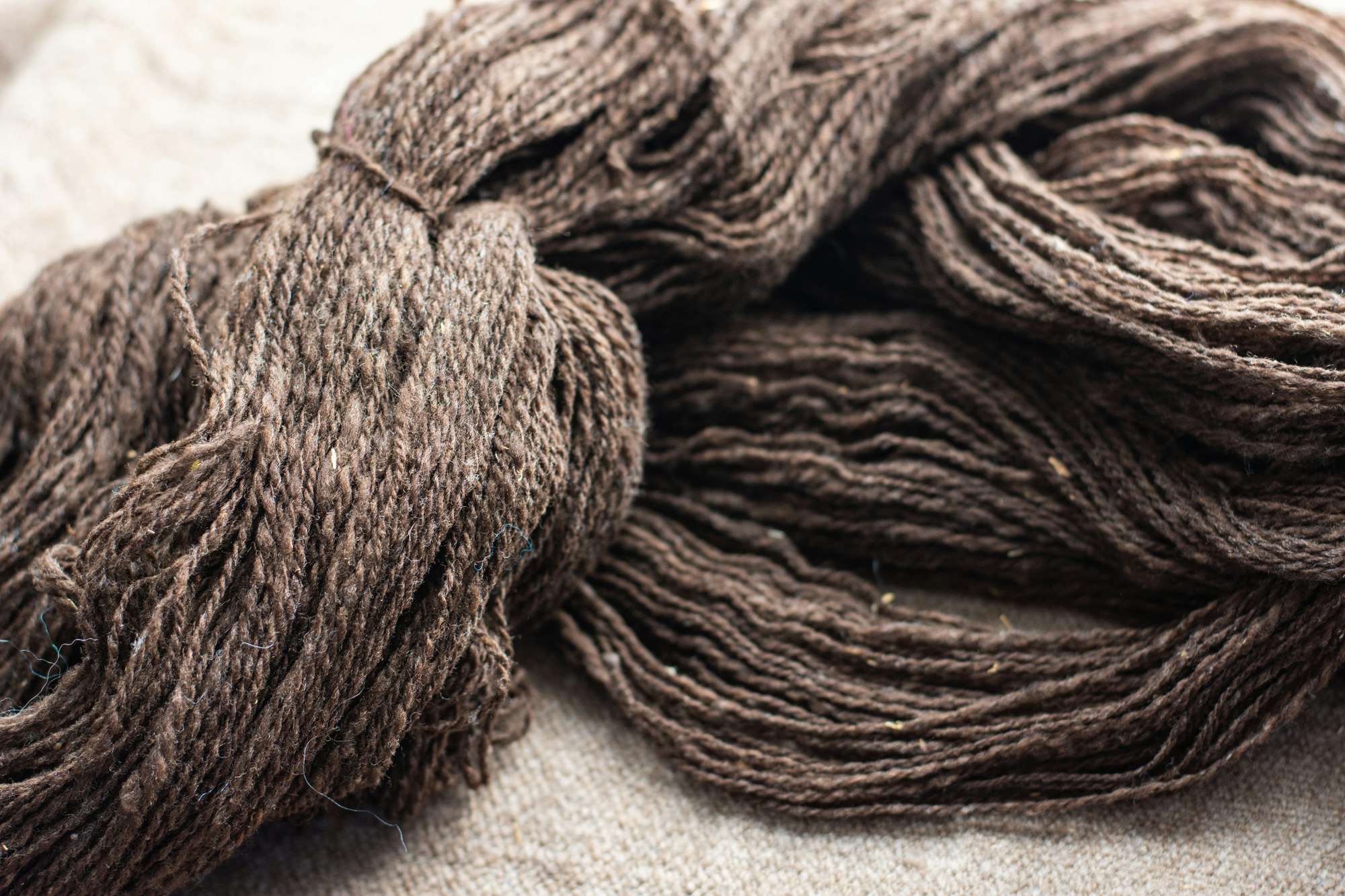 From left: Pamela wove fabric with rose gray Cormo wool, a skein of Pamela's handspun brown Cormo, and a skein of dyed Cormo wool from Sincere Sheep.