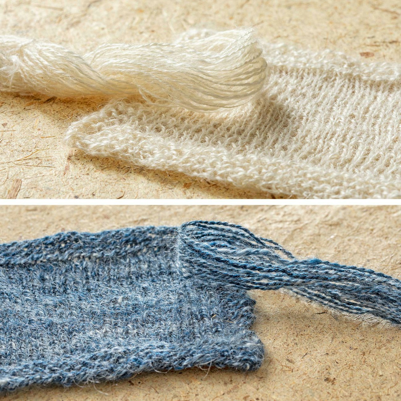 Kid-grade mohair produced by young goats is the softest. These swatches knitted by Katie Weston show off the fluff factor that comes from knitting with mohair. Top: kid mohair; bottom: kid mohair blended with Merino wool. Photos by Matt Graves