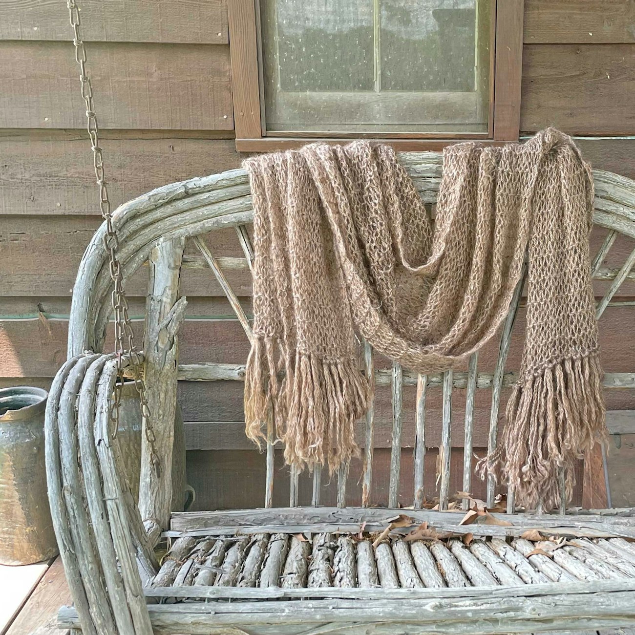 Tina Evans knitted this beautiful shawl using handspun 2-ply yarn from her goat Henna’s dark red fleece. The yarn has a faint halo, and the shawl’s drape comes through even in garter stitch.