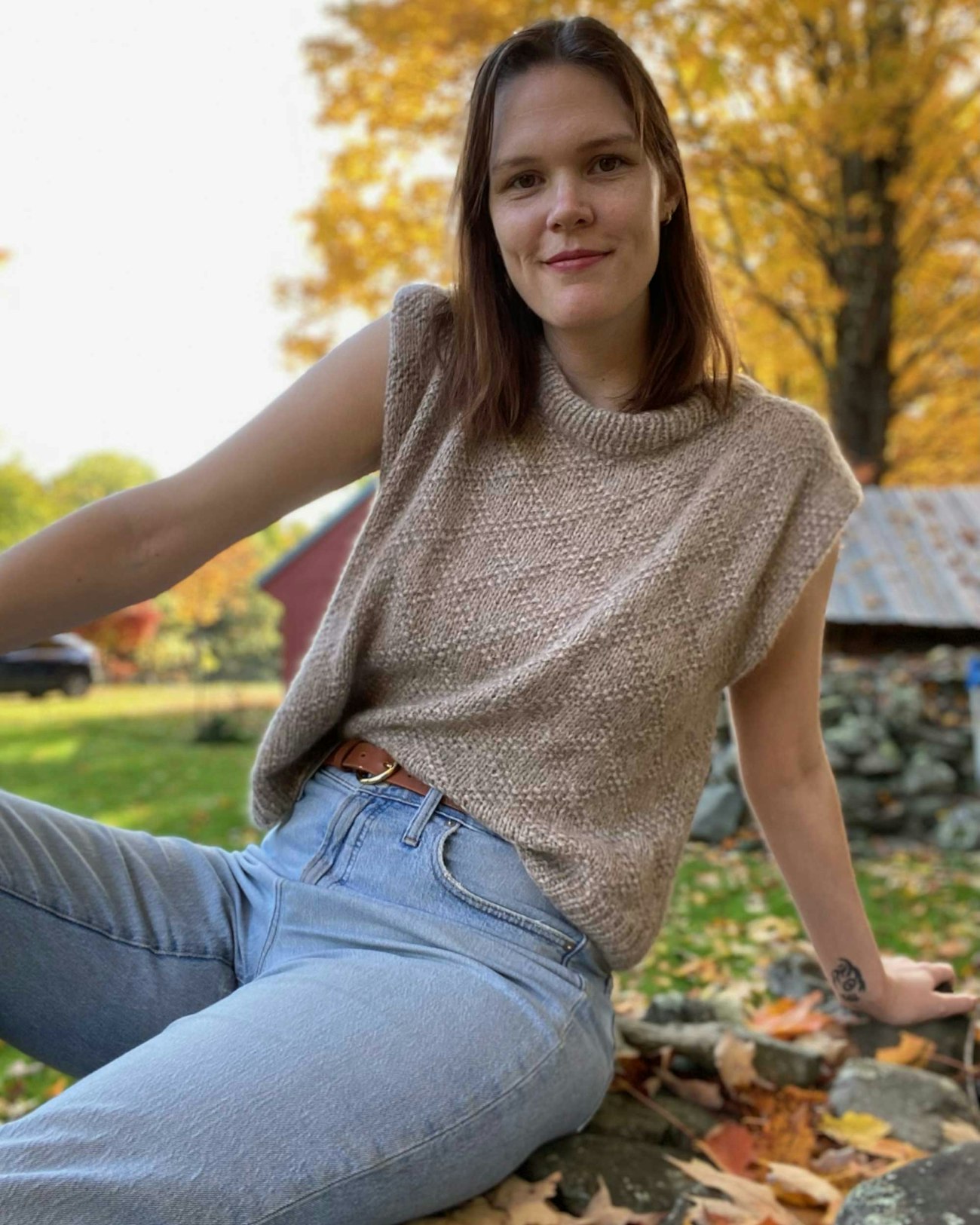 I like wearing it on its own as a tank top, as shown in the photo, or over a white short-sleeve tee. It’s great for fiber festivals and events in warmer weather, where I want to show off my knits, but I don’t want to wear a full sweater or wrap up in a shawl.