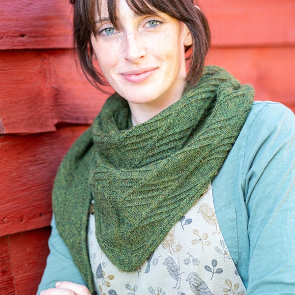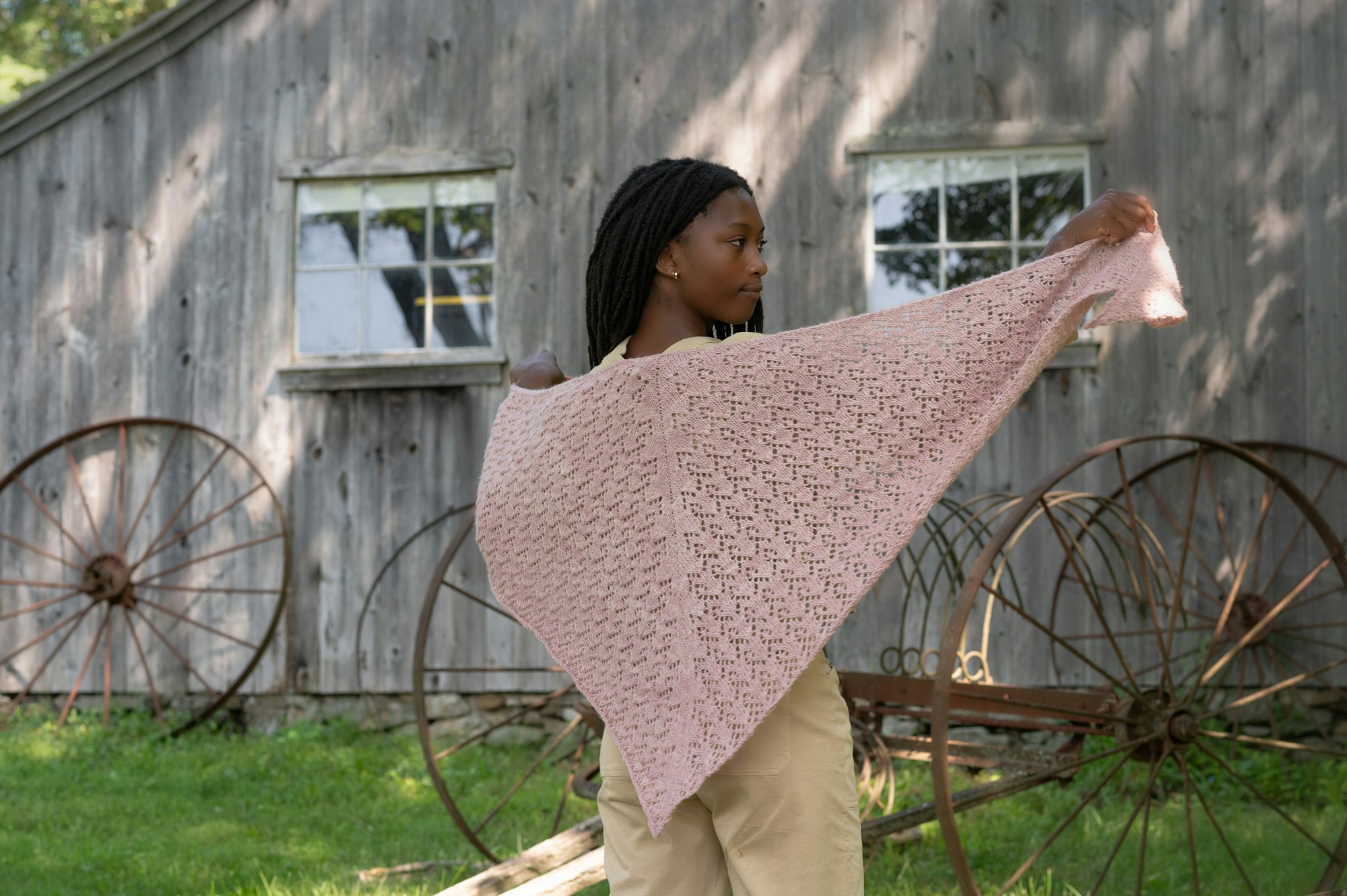 The Gelso Shawl (above) starts at the pointy tip and is worked sideways to the wide end, creating an asymmetrical look when wrapped. This shaping requires steady increases throughout. Meanwhile, the Turnout Shawl starts with a tip, increases to the width of the triangle, then decreases back to the second tip. These are different shapes and methods that create highly wrappable triangles with intriguing stitch orientations.