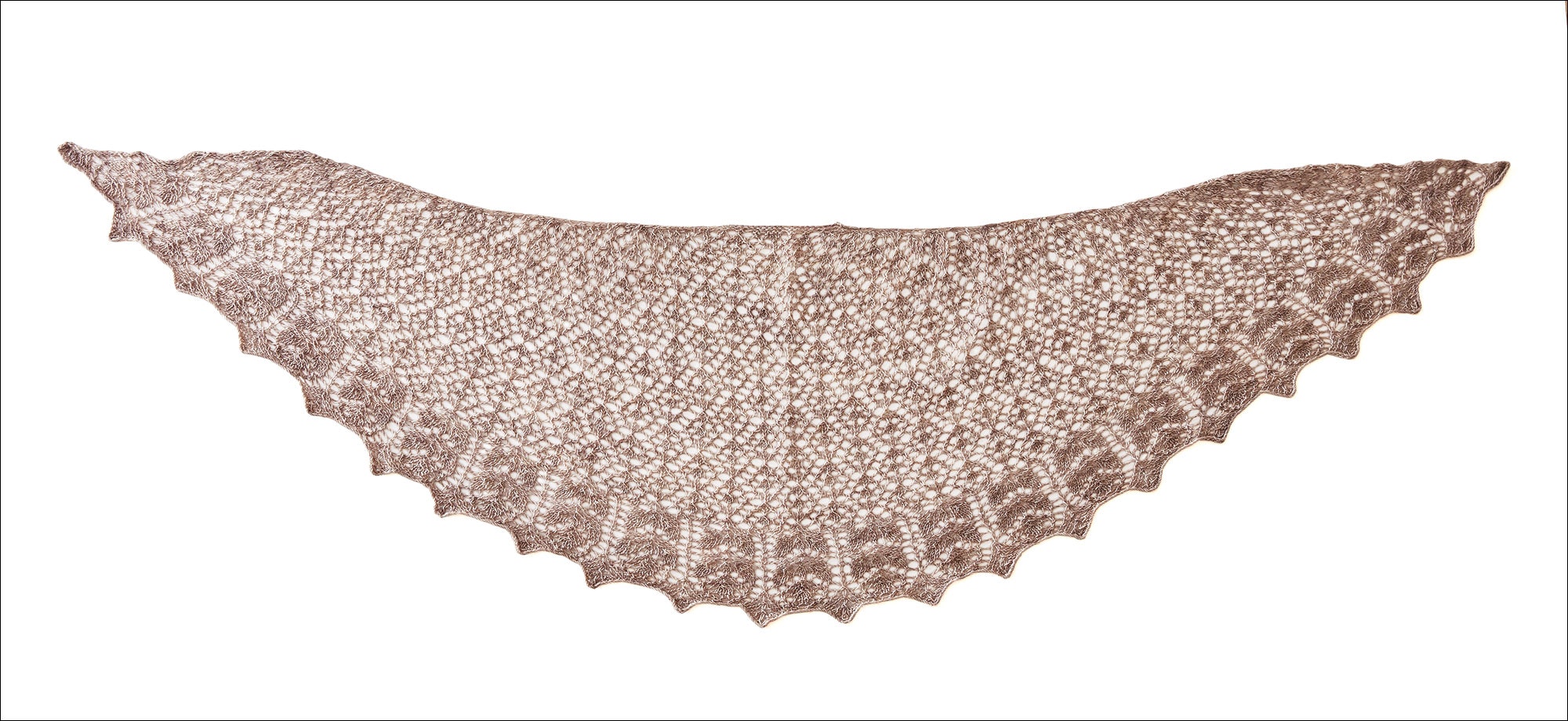 The crescent-shaped Colubrida Wrap is worked from end to end and combines a serpentine lace border with a garter-stitch panel of graduated width. It is tapered at head and tail with increases and decreases worked into the lace pattern.