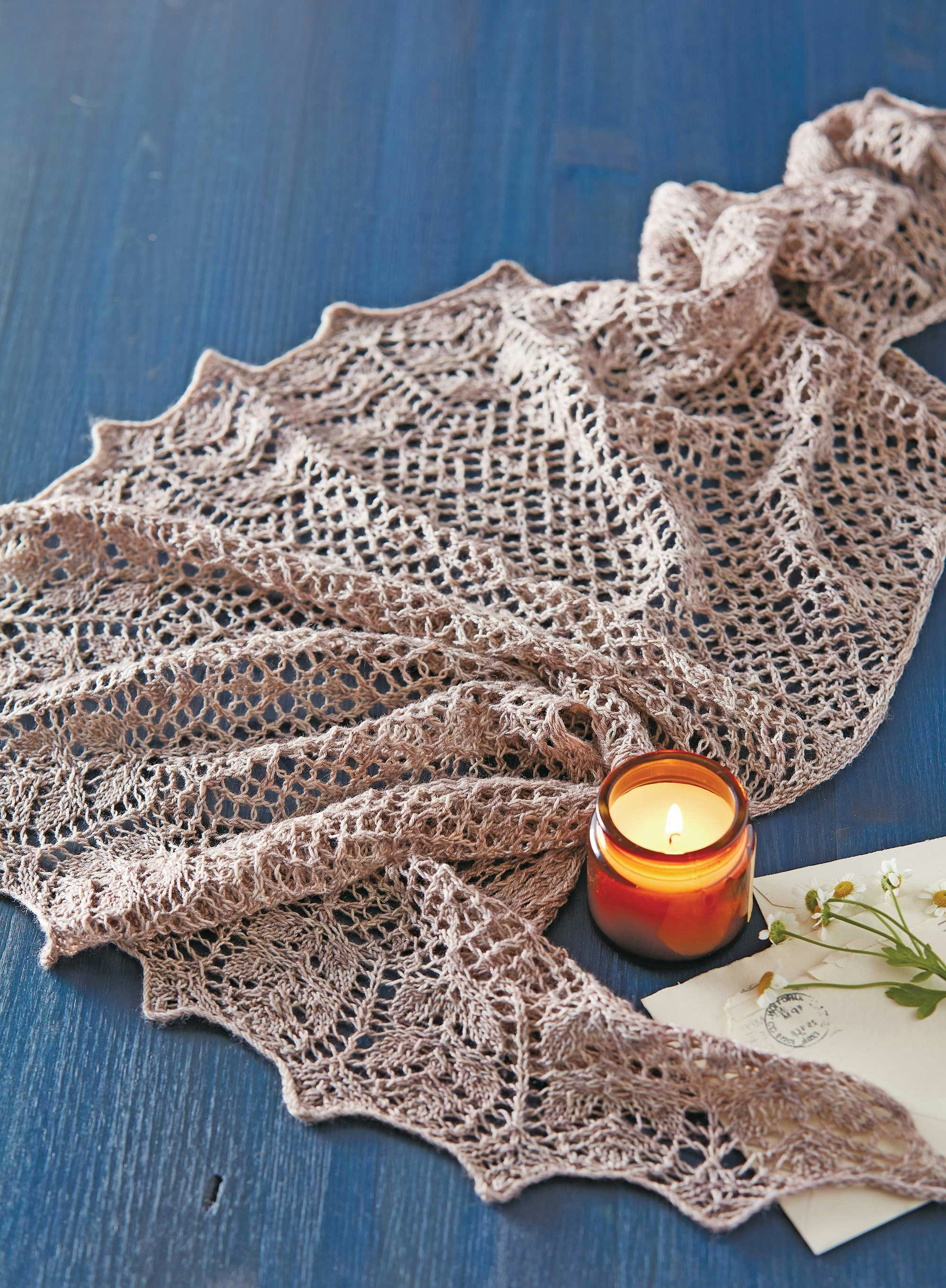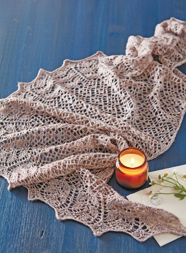 The patchwork effect of entrelac often provides a canvas for color-changing yarns, but designer Hannah Poon uses the technique’s back-and-forth rhythm to add a sweet and subtle lace motif to this generous Bluebell flames wrap. Photo by Nathan Rega